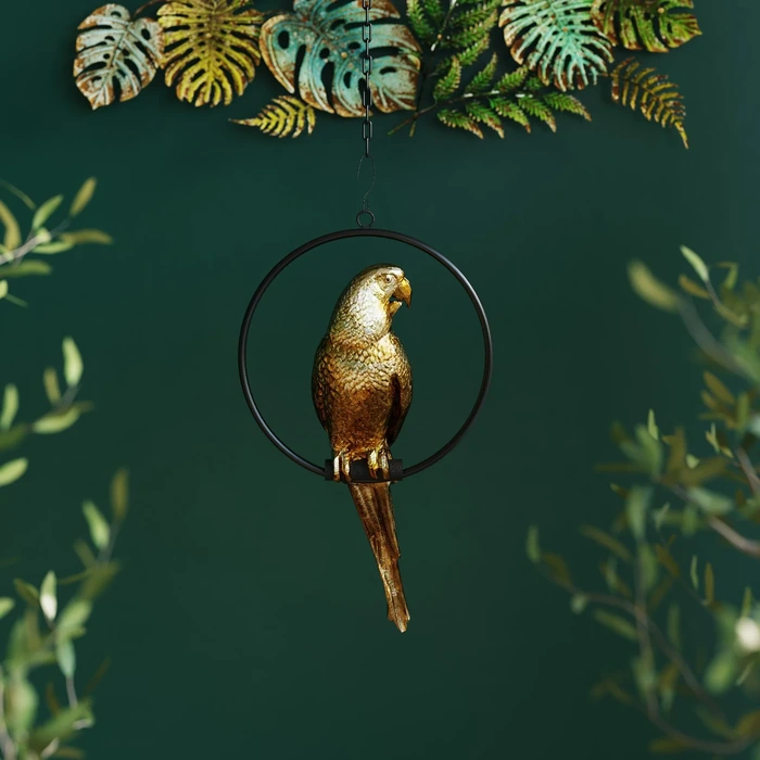 Guldskimrande papegoja på gunga – dekorativ skulptur som ger rummet en lyxig och lekfull karaktär.