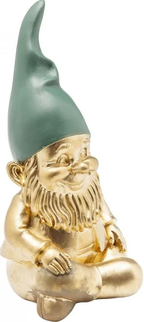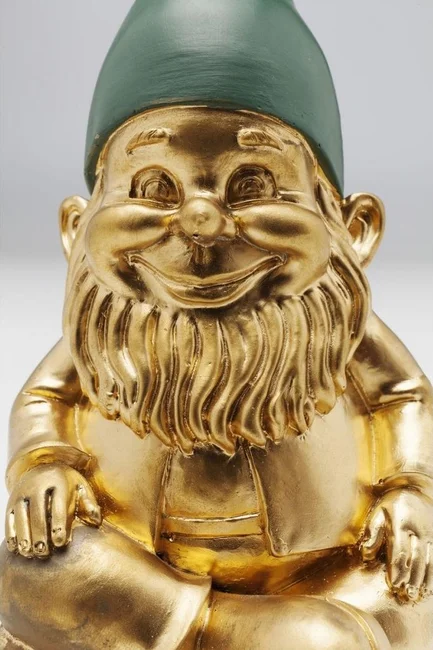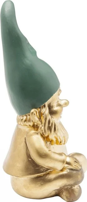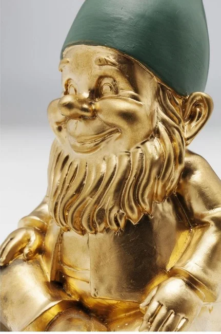 En söt dekoration i form av en gyllene trädgårdstomte sittande i yogaställning.