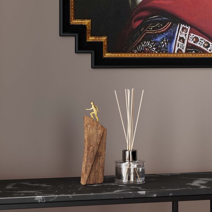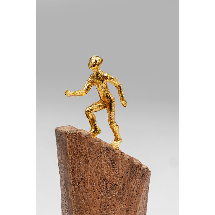 - Skulptur i brun sten-look med vandrare i guldfärg