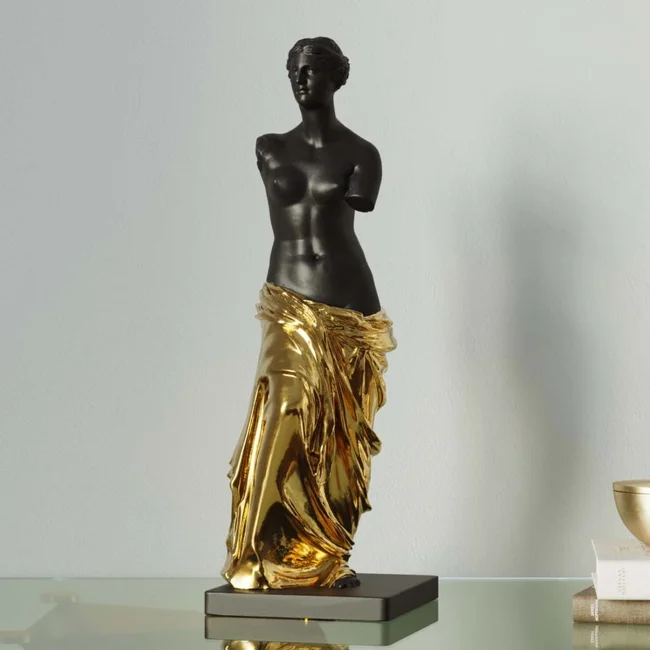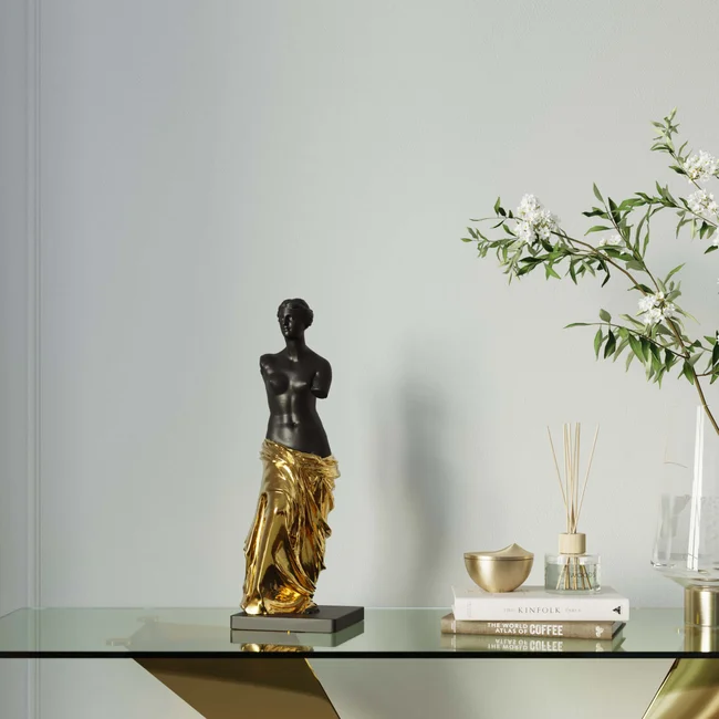 Inredningsidéer för vardagsrummet i palazzostil är populära som ett sätt att lägga till elegans och glamour till atmosfären. Detta demonstreras av den dekorativa statyn av en romersk skönhet, som vårt designteam har nedsänkt i matt, dramatiskt svart och guld. På en höjd av nästan 50 cm kommer det att göra ett spektakulärt intryck i korridoren eller vardagsrummet och kommer att förvandla alla hem till ett palats.