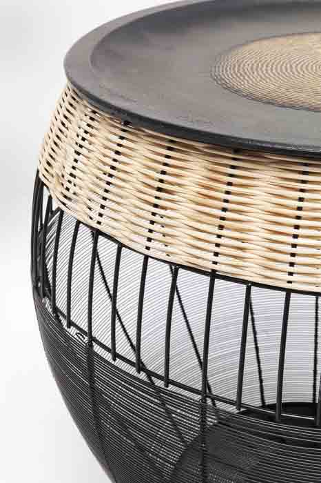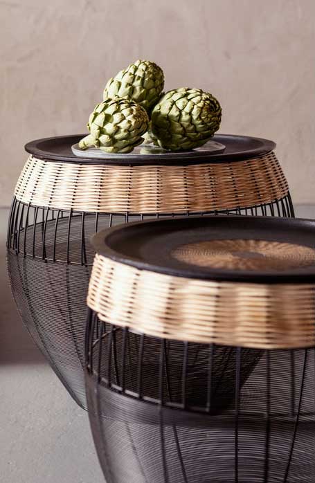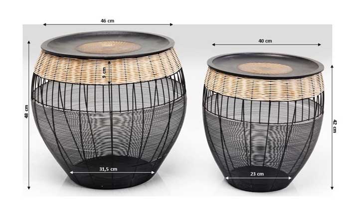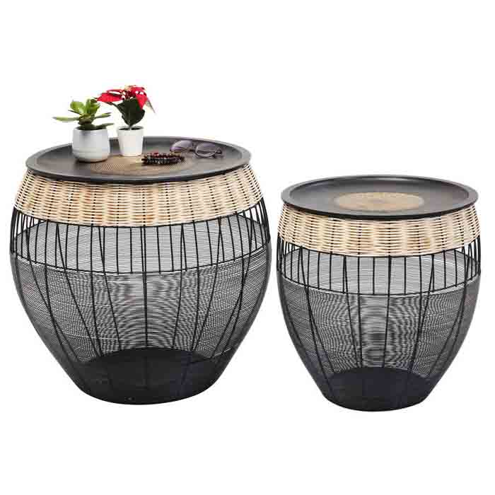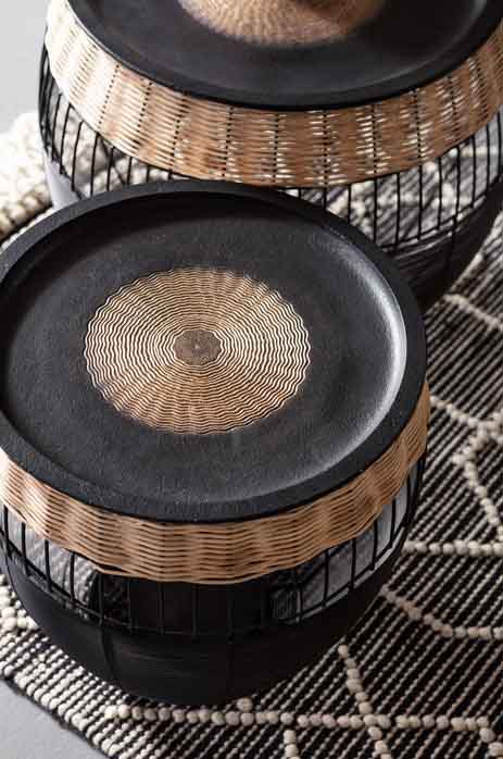 Två mycket fina småbord - ett gediget hantverk i etnisk design inspirerade av afrikanska trummor. Borden är tillverkade för hand i ett fint trådnät av pulverlackat svart stål och rotting samt dekorativt mässingsfärgat mönster på bordsskivorna.