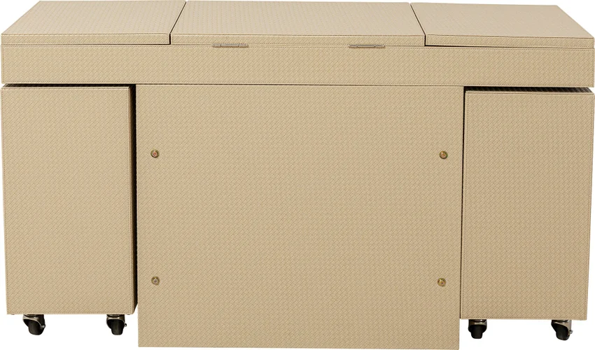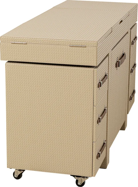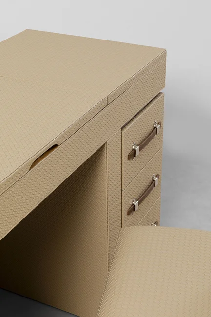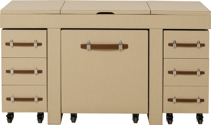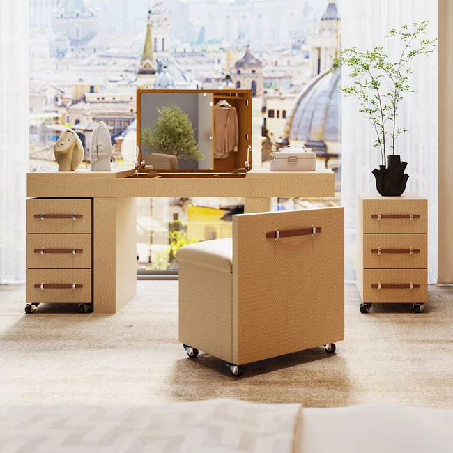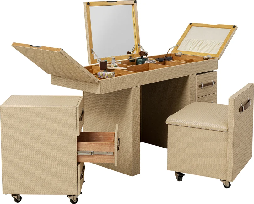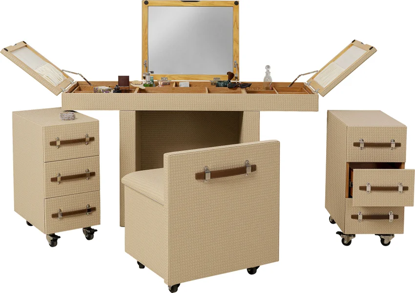 Ge din sminkhörna en ny dimension med detta mobila bord i den varma beige-färgen. Det eleganta bordet har många funktionella detaljer. Den är robust gjord av träfiberskivor med medeldensitet täckt med en chic, flätad look. Övriga detaljer är skapade med askfaner. Sminkbordskombinationen är monterad på stålhjul så att du enkelt kan flytta runt den. Detta sminkbord har en sittpall (56x5x46x57cm) som passar perfekt under bordet. Det finns också två mobila behållare med lådor, samt många fack i bordsskivan för att förvara dina smink- och skönhetsprodukter och andra kosmetiska redskap på ett funktionellt och välskyddat sätt. Kan även användas som ett annorlunda skrivbord! Smart förvaring när den är som bäst.