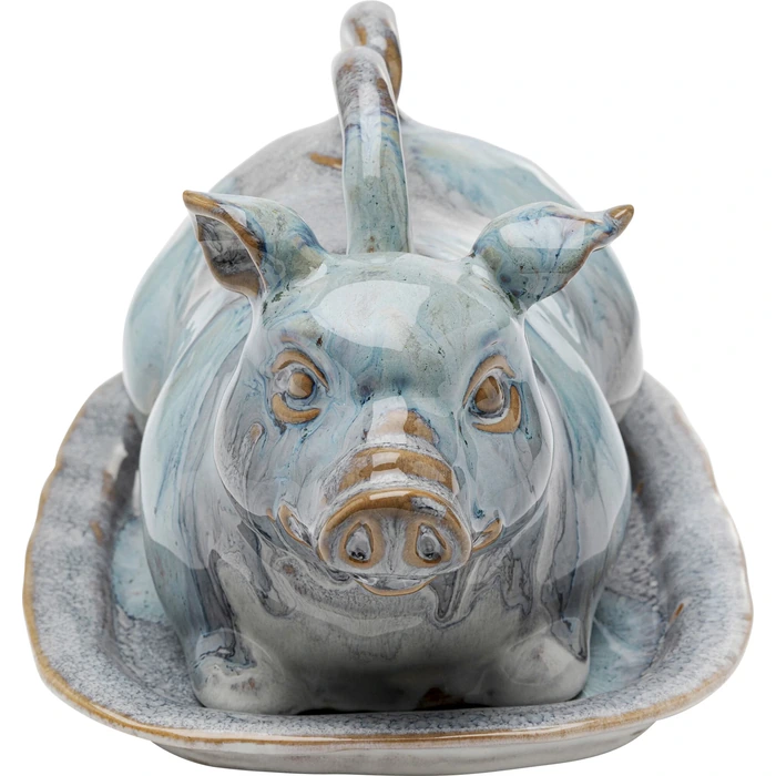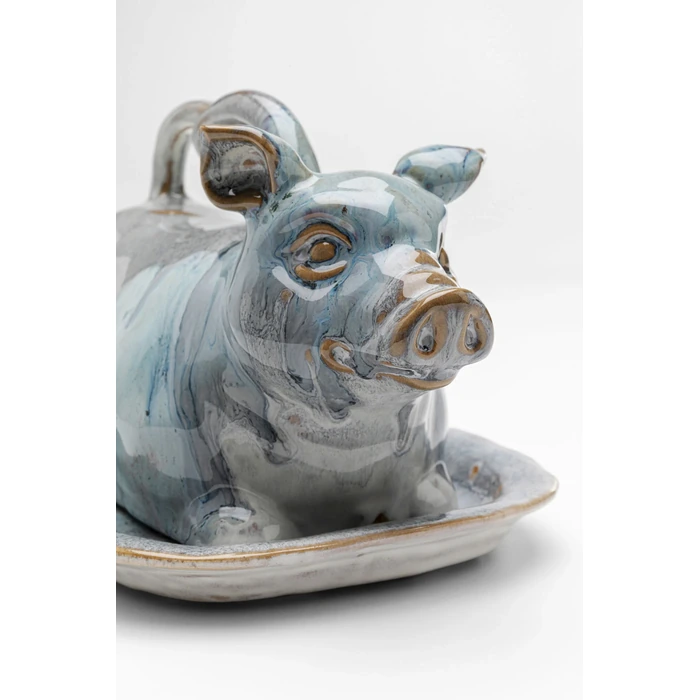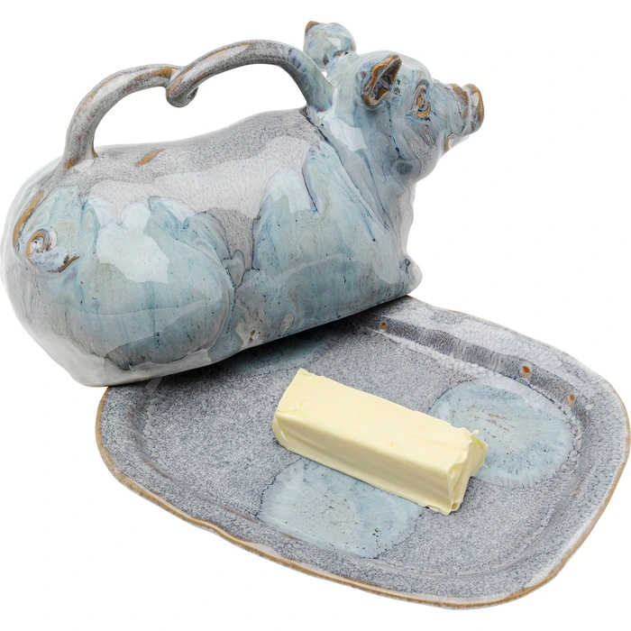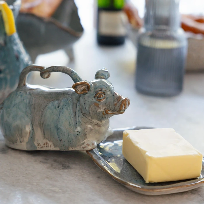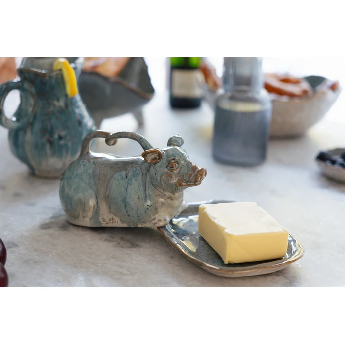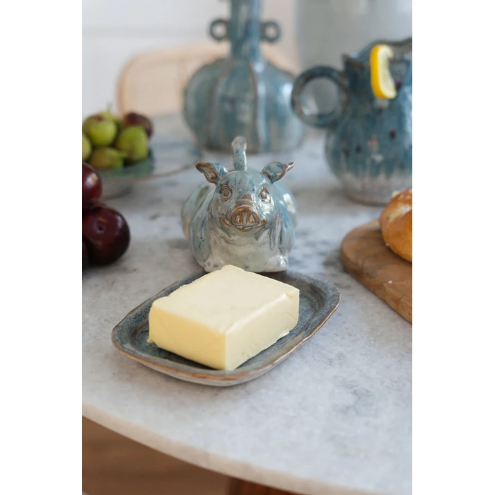 Smörkupa Gris blir en personlig detalj på frukostbordet – lika fin till vardag som till helgdukningen. Den glaserade finishen i ljust blå grön och den generösa storleken gör den praktisk och lätt att rengöra.