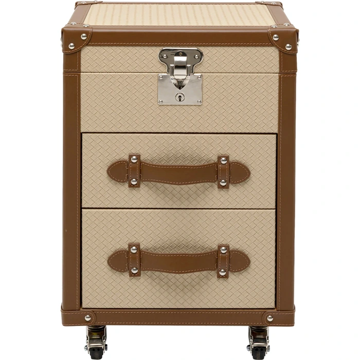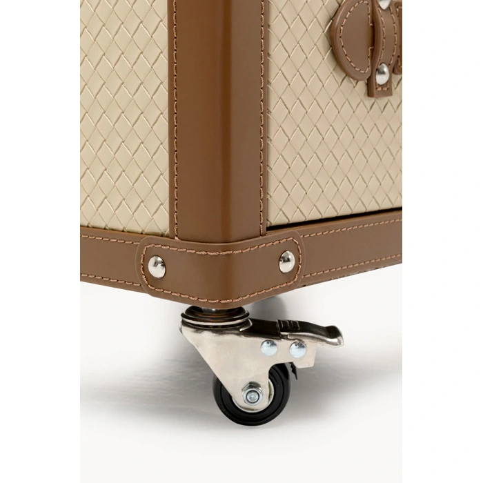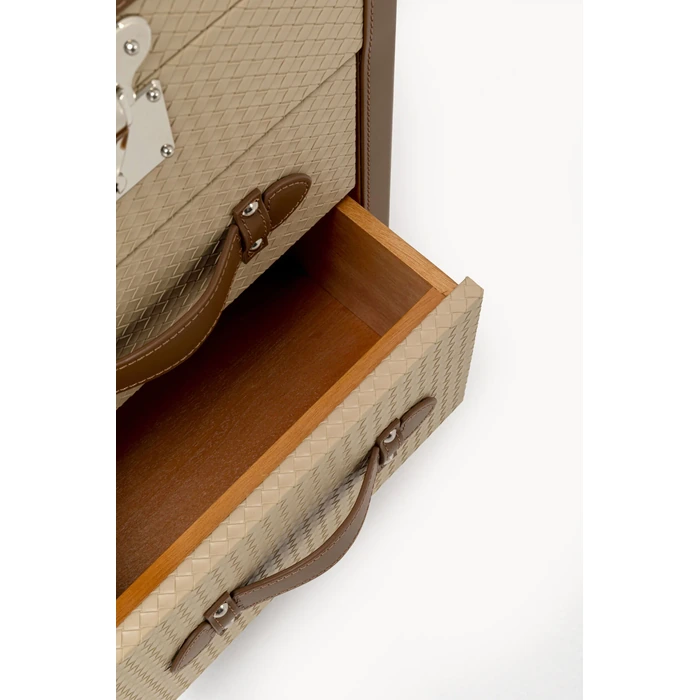 Möbeln är tillverkad av MDF, askfaner, spegelglas och klädda detaljer i polyuretan och polyester, vilket skapar en stilren men samtidigt tålig konstruktion. Den är utformad för att ge organiserad förvaring av smycken, accessoarer och andra mindre personliga föremål. Den speglande ytan tillför både funktion och ljus till rummet, samtidigt som den förstärker den eleganta karaktären.