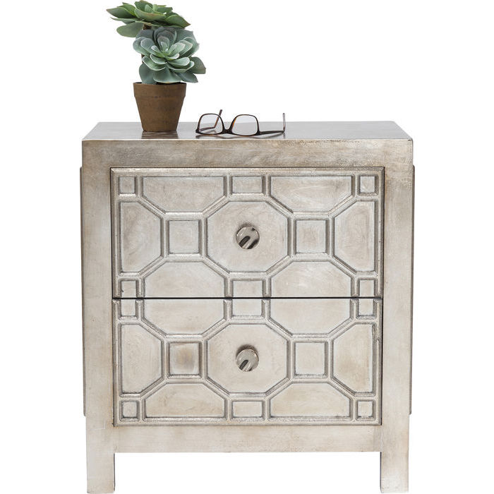 Ett elegant sängbord med orientalisk touch, snyggt i varm metallic-finish.