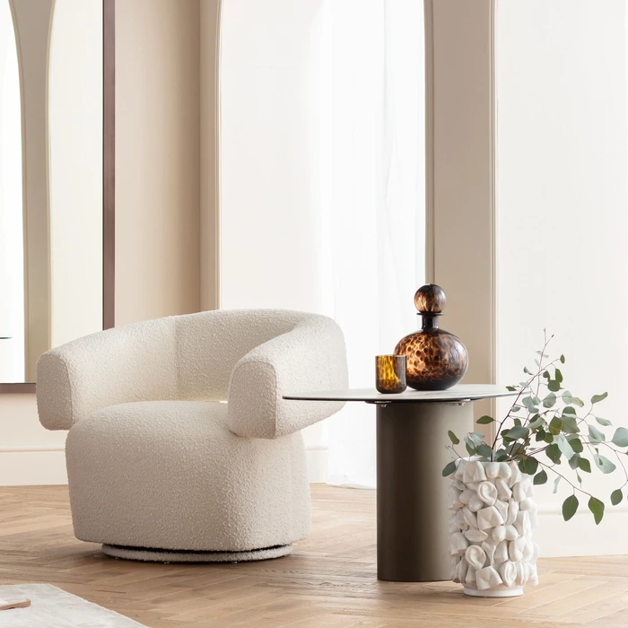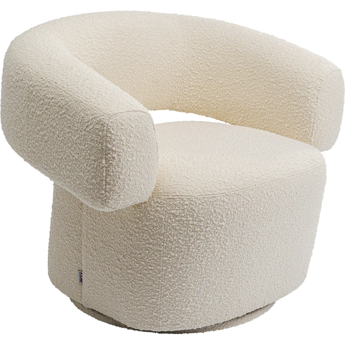 Kompakt snurrfåtölj i bouclé – omfamnande rygg, stabil bas och skön loungekänsla i liten yta.
