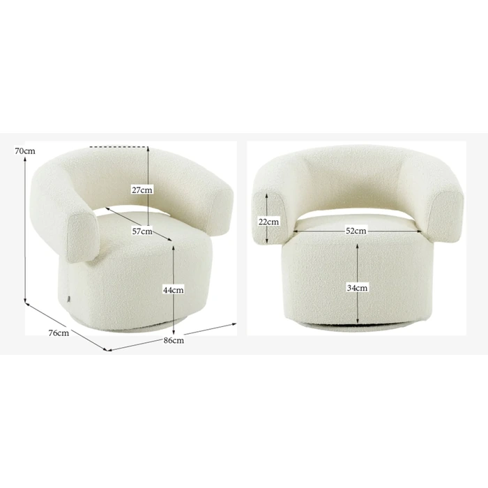 Material: Klädsel: 100 % polyester (bouclé); stomme: plywood; nosagfjädring; sitthöjd 44 cm; max 150 kg; 360° roterbar