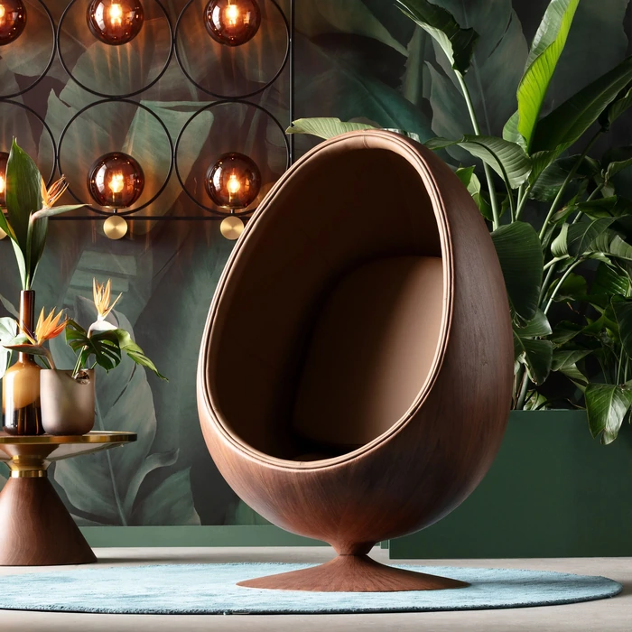Snurrfåtölj med äggform och valnötslook i generösa mått. En loungestol som ger rummet karaktär.