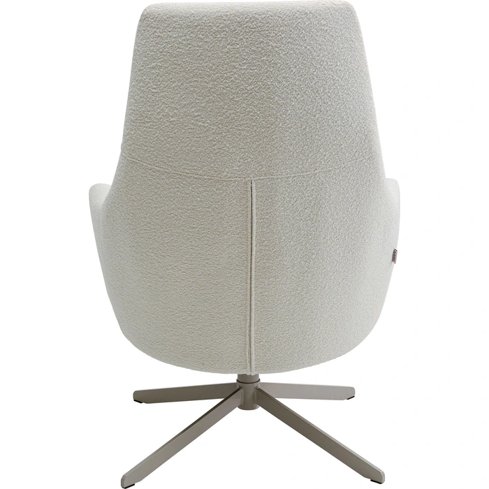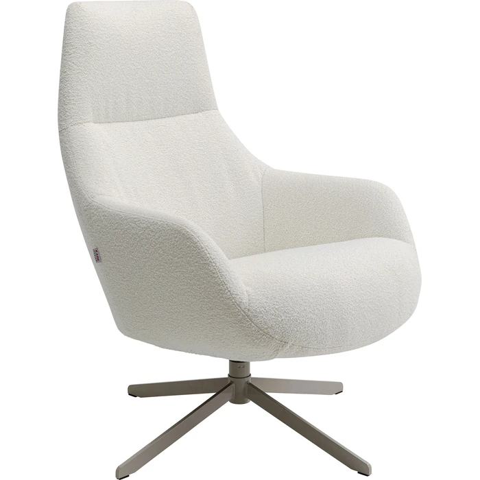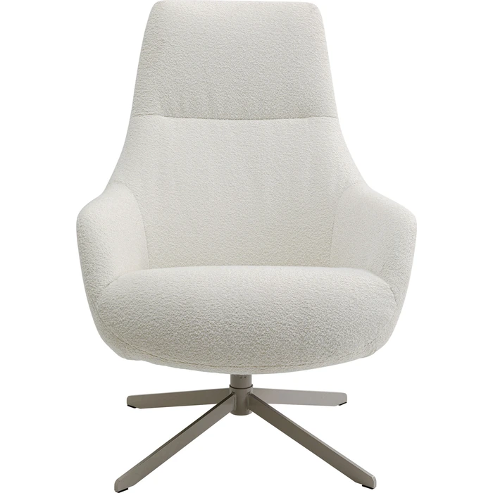 Elegant snurrfåtölj i creamfärgad bouclé med hög komfort och modern design.