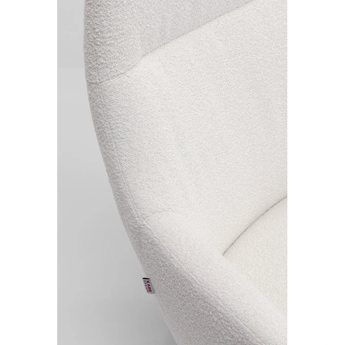 Snurrfåtölj Mimi kombinerar stilren elegans med genomtänkt komfort och passar perfekt i både vardagsrum och hemmakontor. Den mjuka boucléklädseln i creamvit ton ger ett ljust och exklusivt uttryck, medan den höga ryggdelen och de bekväma armstöden skapar en avslappnad sittupplevelse.
