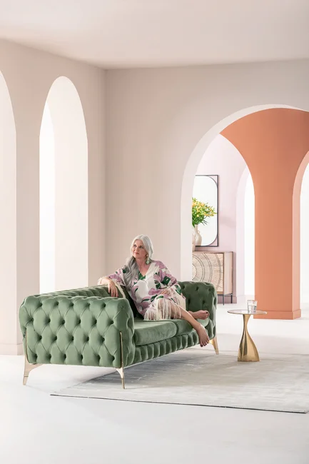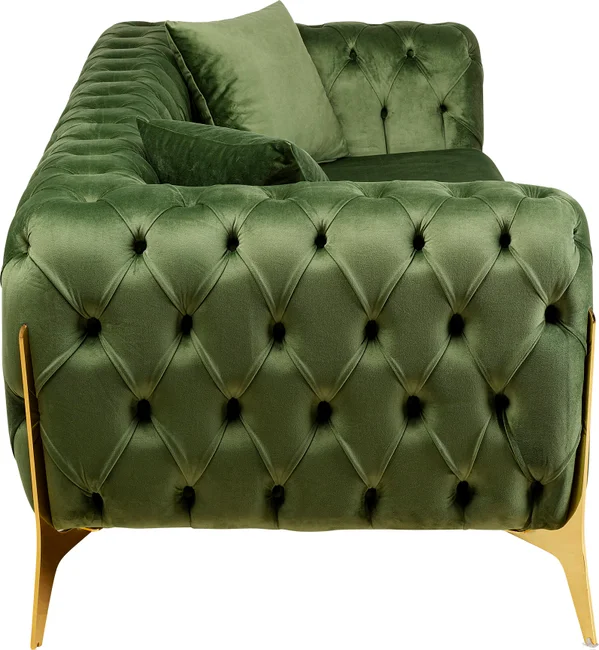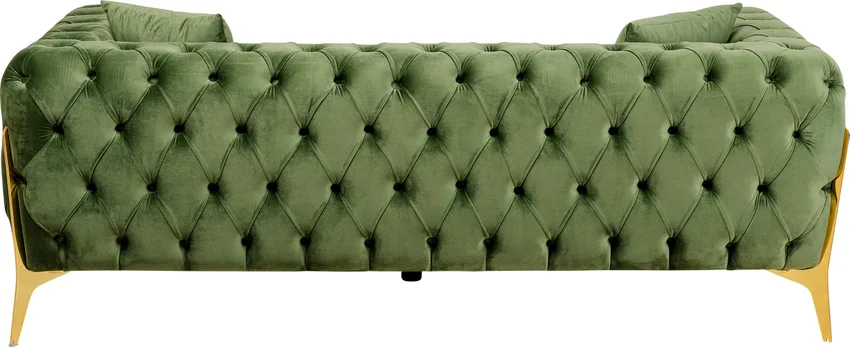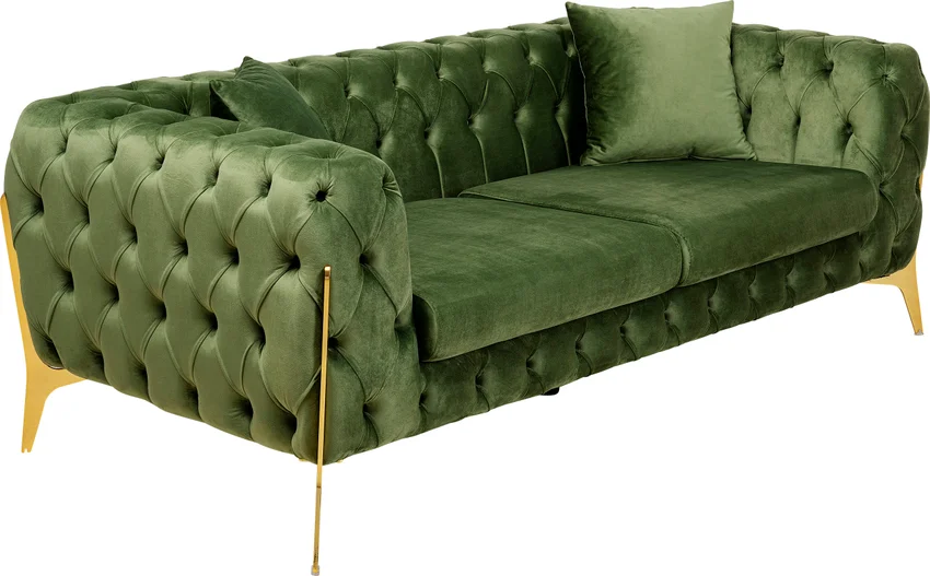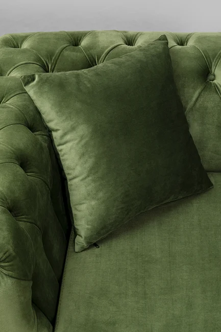 Denna lyxiga 2-sits soffa är en detaljrik sittmöbel för vardagsrummet med djup-häftad rygg, djupa nitar i sätet och i en elegant mörk olivgrön nyans på sammetslent tyg. En otroligt vacker inbjudande soffa som utger en känsla av lyx och flärd. Kroppen är gjord av massivt bokträ och erbjuder stabilitet. Den mörkgröna allroundklädseln ger soffan ett särskilt raffinerat och högkvalitativt utseende tillsammans med de mässingfärgade benen. Chesterfield-stilen med knappsömmar gör denna sammetsfåtölj till en klassiker och passar lika väl in i vardagsrummet hemma som en soffa för dina gäster i salongen eller baren.