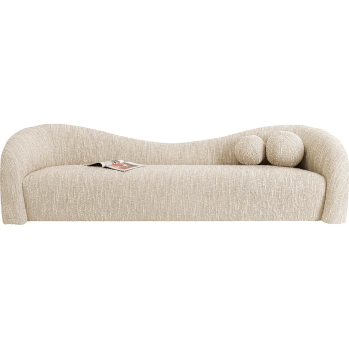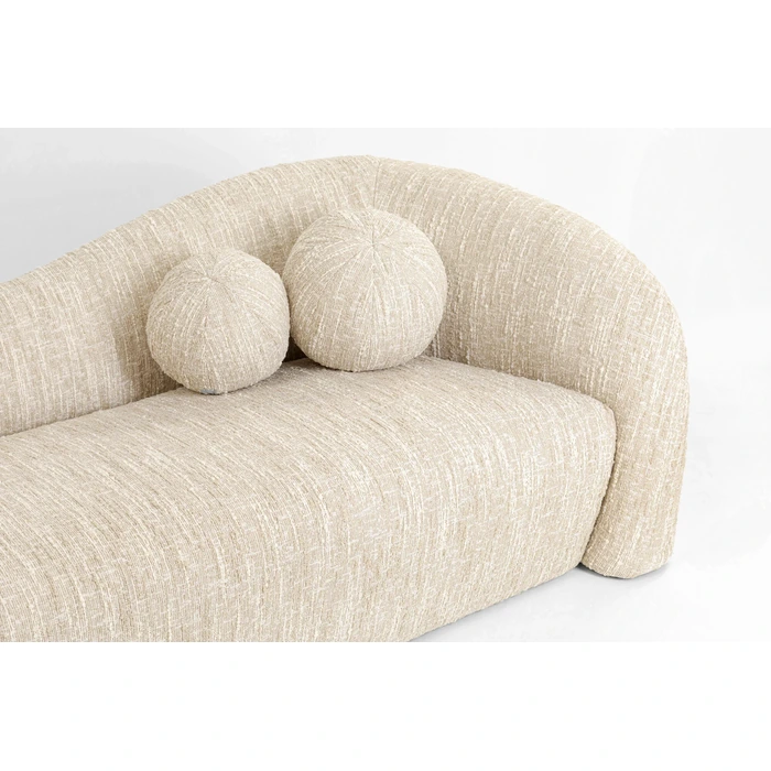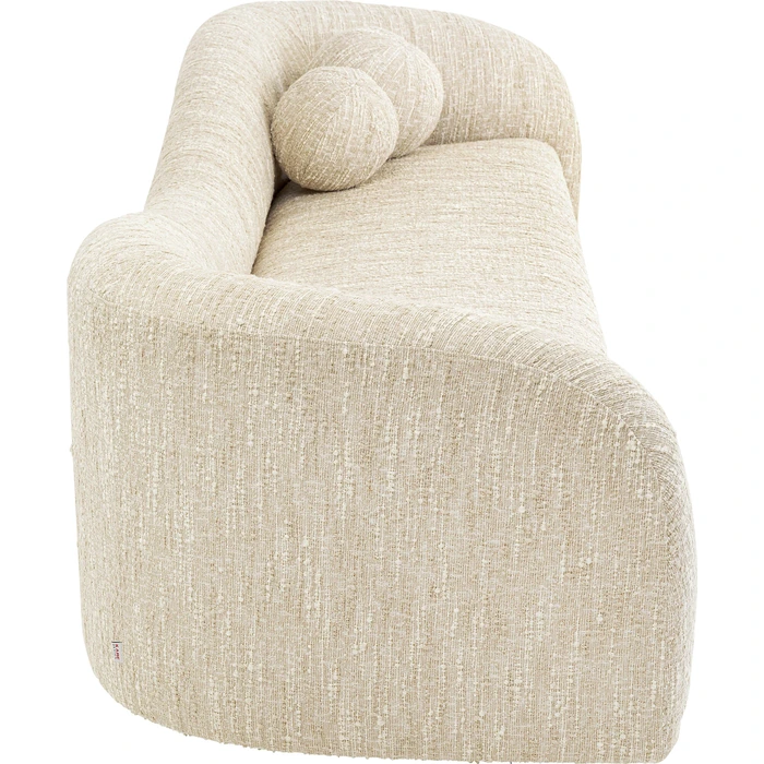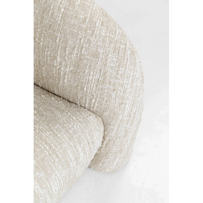 En generös 3-sits som kombinerar mjuka kurvor med stabil komfort. Den melerade, krämfärgade klädseln i slitstark polyester ger ett varmt uttryck och är lätt att matcha med trä, metall och naturtoner.