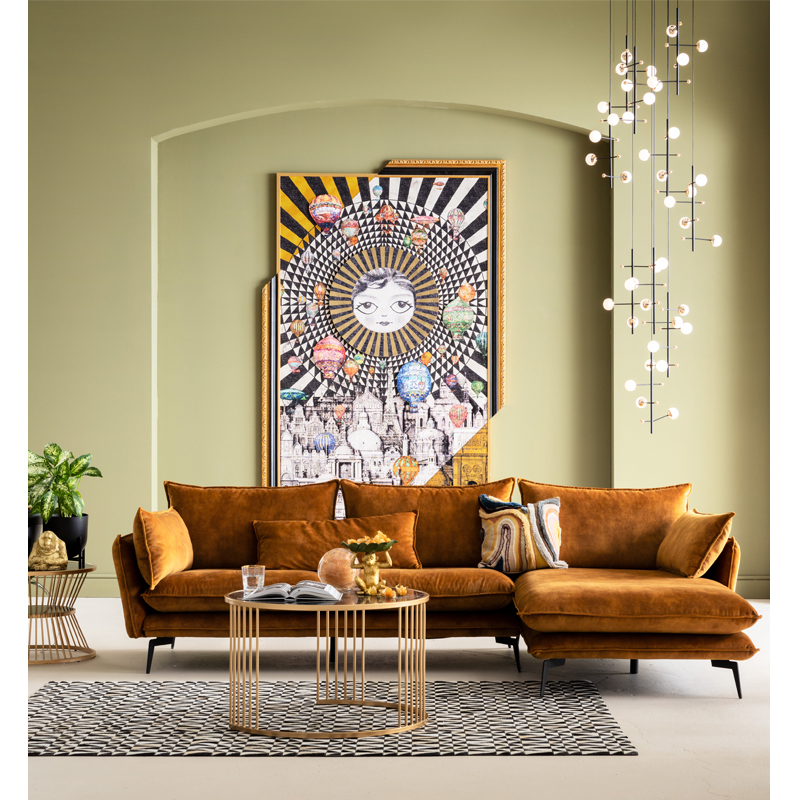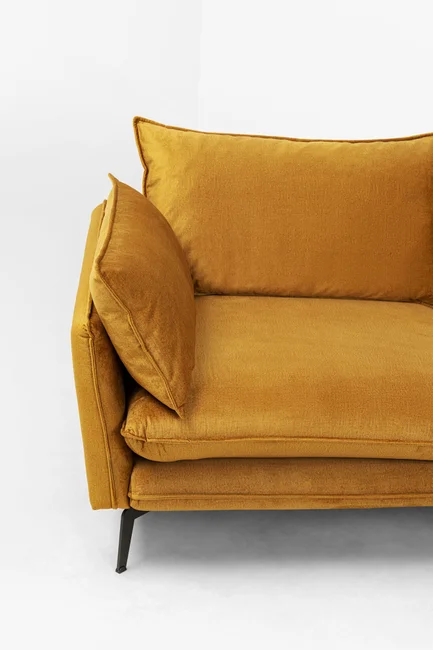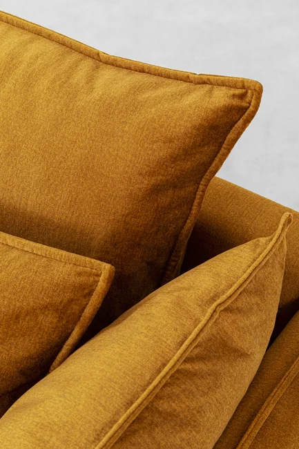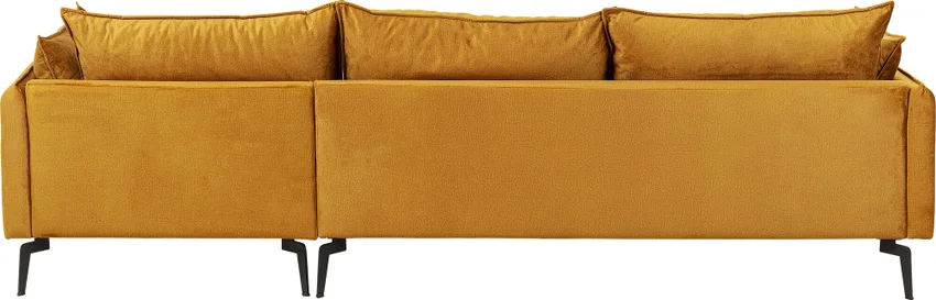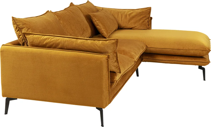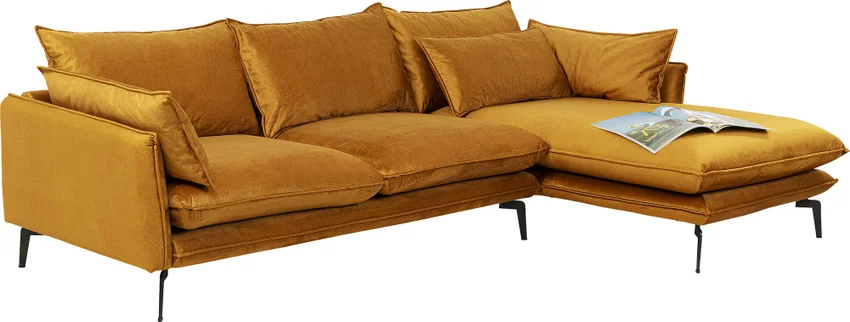 - En modern, högerställd hörnsoffa i en fashionabel sammetslook i gul curry