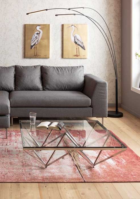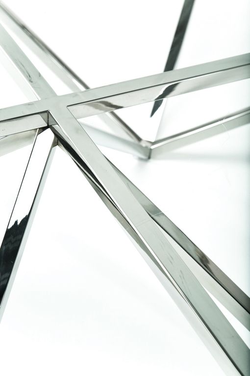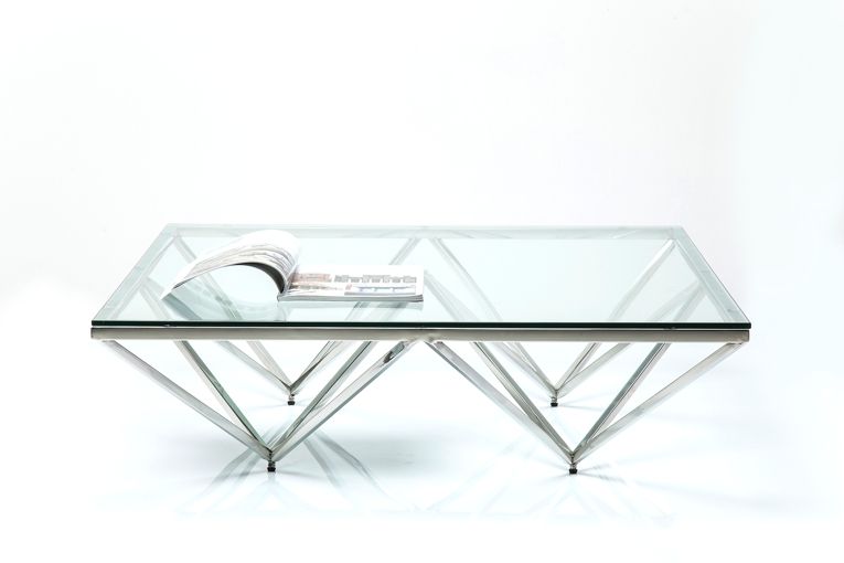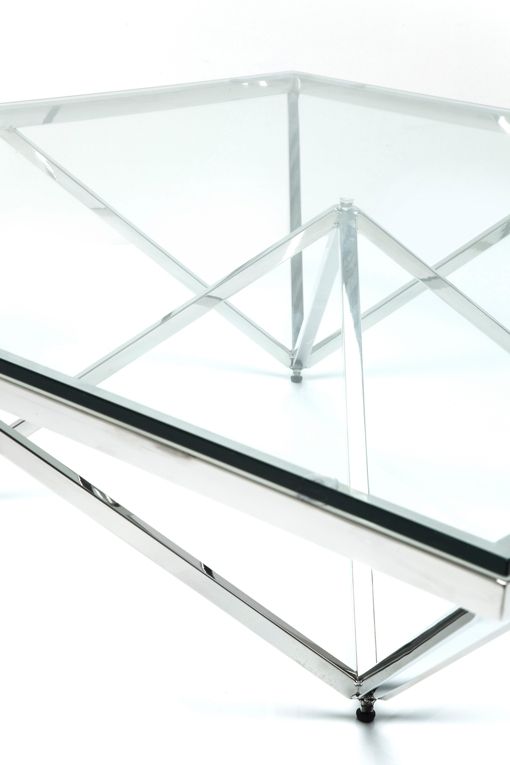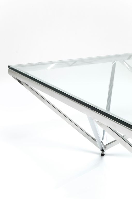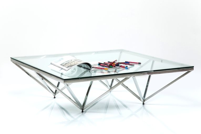 Modernt stort soffbord i spännande design. Den rejäla glasskivan bärs upp av ett elegant underrede av rostfritt kromat stål. Designen är luftig och lätt. Finns även med underrede i guldpläterad finish.Material: Underrede i högblankpolerat rostfritt stål, bordsskiva i härdat glas. Mått: höjd 32 x längd 105 x bredd 105 cm. Vikt: 41,7 kg.