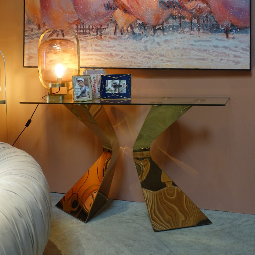 Konsolbord Gloria är ett elegant glasbord med ett graciöst, stilrent underrede i mässingsfinish. Konsolbordet är ett blickfång i hallen, vardagsrummet och matrummet. Även läckert i ett dressingroom sin sminkbord! Se även Konsolbord Grace Silver med ben i högblankt krom. Basen är av elektropläterat rostfritt stål med en härdad glasskiva, 13 mm i tjocklek.