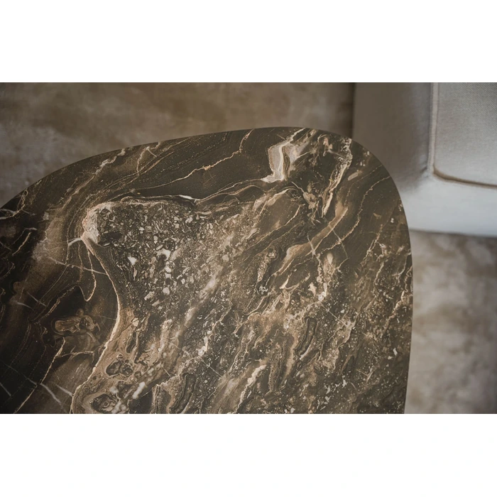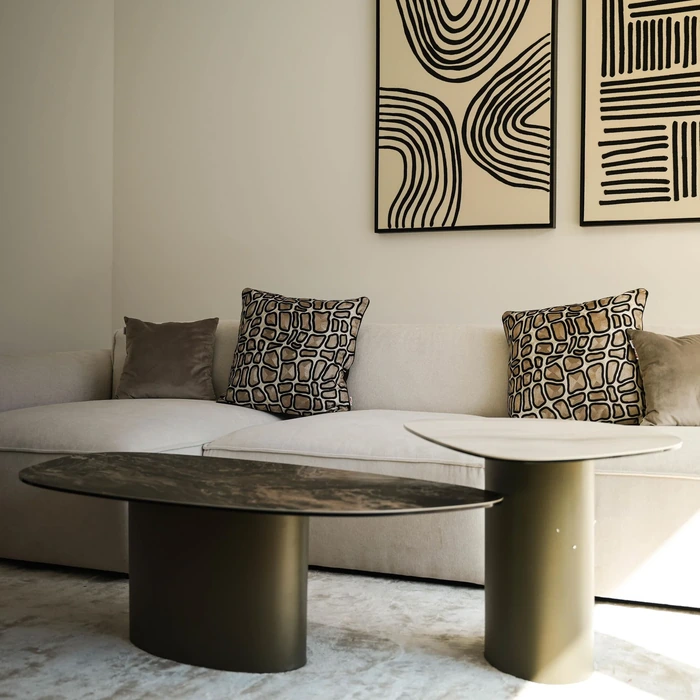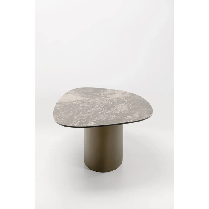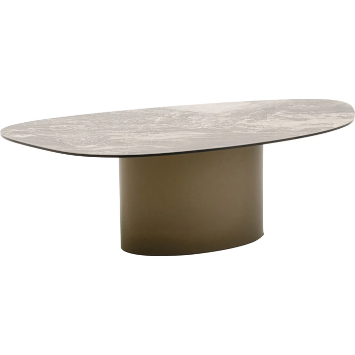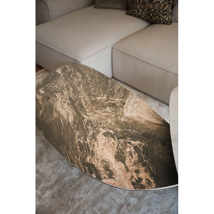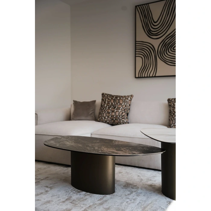 Ett riktigt konstverk för vardagsrummet – detta ovala soffbord kombinerar skulptural elegans med funktionell design. Den organiskt formade bordsskivan i fint marmormönstrad keramik ger rummet en exklusiv och lyxig karaktär som fångar allas blickar. Den centralt placerade basen i pulverlackerat stål ger inte bara stabilitet, utan skapar även en spännande kontrast mot de mjuka formerna. Bordet fungerar perfekt som en elegant yta för dekorationer, som serveringsbord eller som rummets naturliga mittpunkt i en modern inredning. Helhetsintrycket blir särskilt harmoniskt tillsammans med soffor i dämpade toner, texturerade textilier och lampor i metalliska nyanser – ett bord som förenar konstnärlig estetik med praktisk användbarhet.