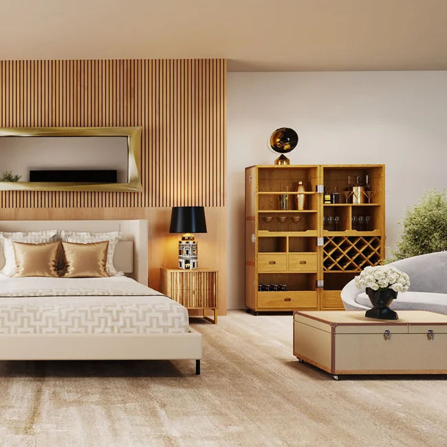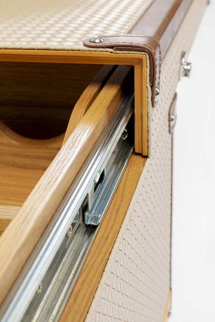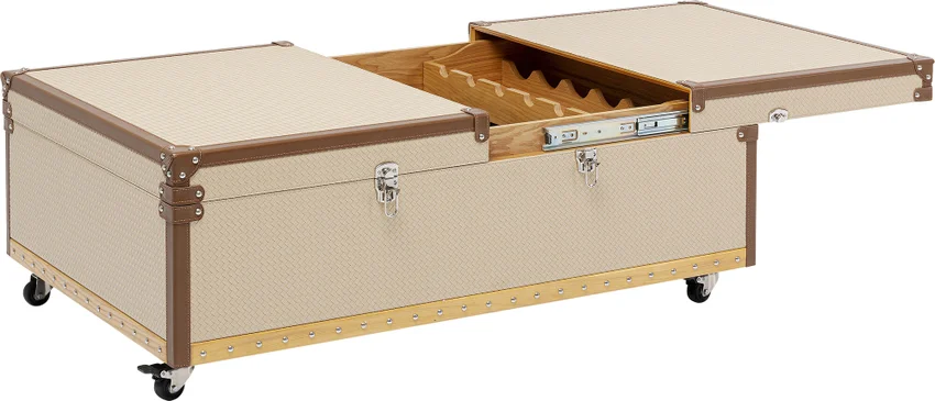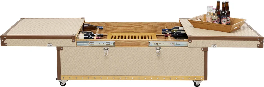 Hur kan funktionalitet, plats-besparande lösningar och stil kombineras? Genom möbler med utseendet som resväskor på hjul, iklädd en haute couture-outfit! Med kollektionen Old New York kan du tillföra stil till ditt vardagsrum. Ytan på soffbordet har ett lättskött textilöverdrag i en elegant flätad look. Den kreativa designen, inspirerad av formen på en oceangående koffert, gör bordet till en riktig höjdpunkt. Detta rektangulära soffbord kommer att skära en snygg figur i vardagsrummet. Inuti rymmer den alla redskap för din hemmabar. Praktiska hjul gör den mobil, mångsidig och funktionell. Detta soffbord är ett måste för alla som vill kombinera modern design med funktionalitet.