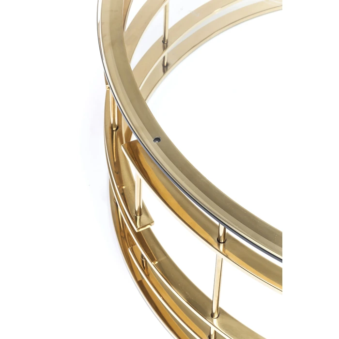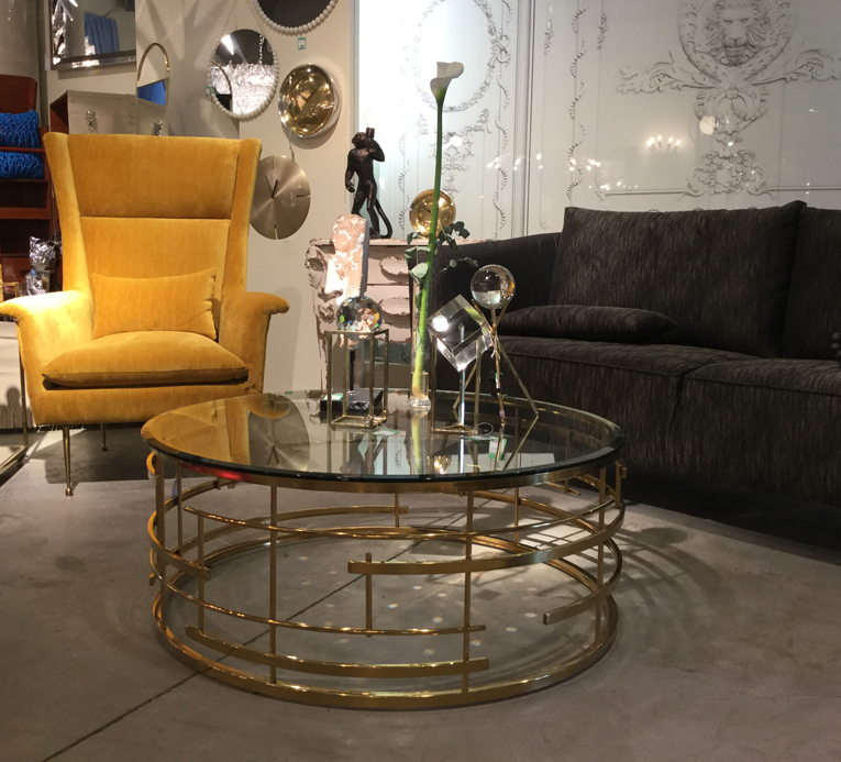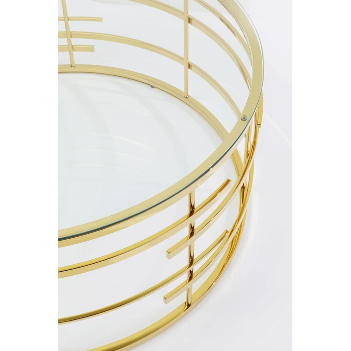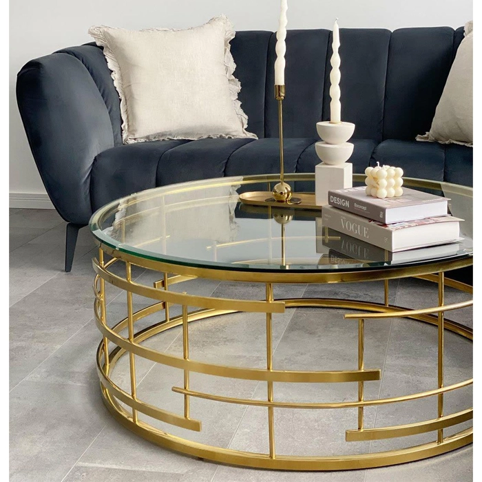 - En uppgradering med glamour: ett runt soffbord med en spännande, gyllene ram av rostfritt stål och en glasskiva
