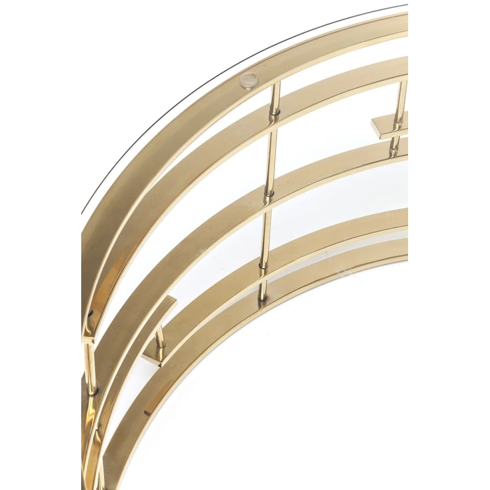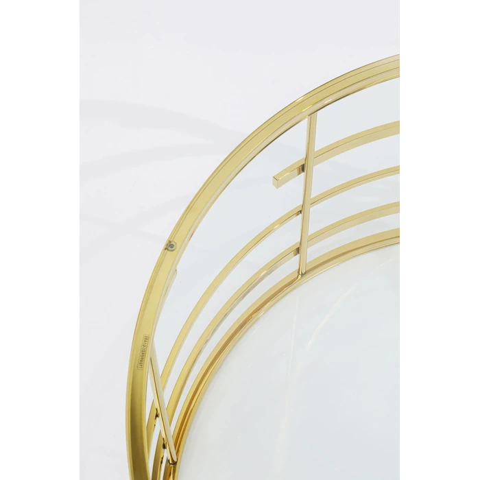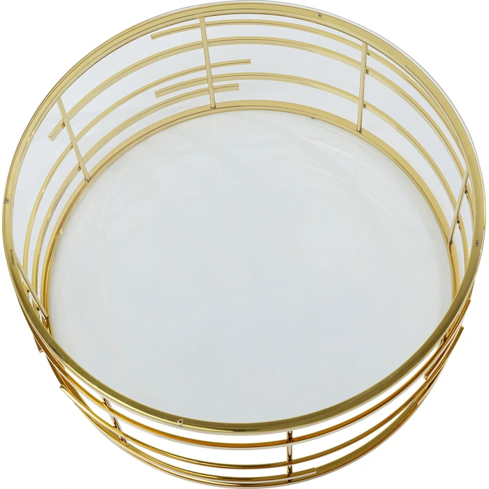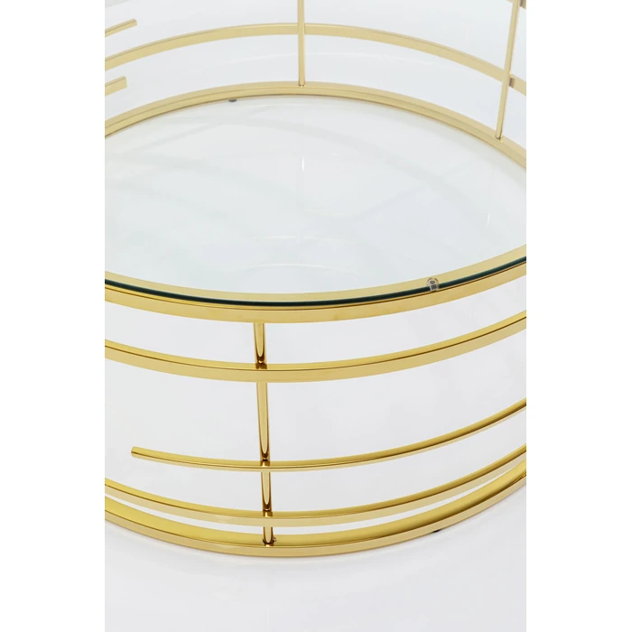 Ett riktigt snyggt och sobert runt soffbord med spännande underrede i mässing och med bordskiva av glas. Bordets öppna form och glasskiva bidrar till en rymlig känsla i rummet. Oavsett om soffbordet är till för att matcha sofflandskapet eller loungen bredvid två stora fåtöljer: tack vare den estetiska ramen ser den här lyxiga möbeln inte bara ljus ut i rummet, utan lägger också till en extra touch av glamour i atmosfären.
