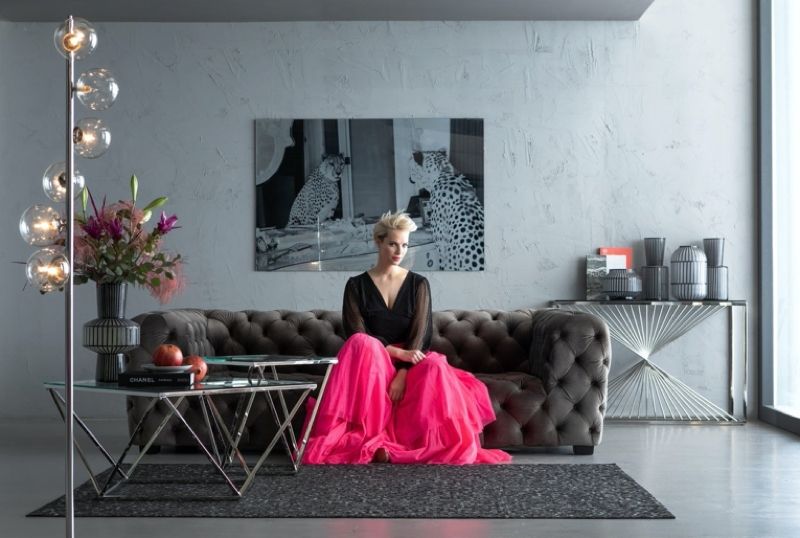 Stilrent soffbord i glas och silver med asymmetrisk design