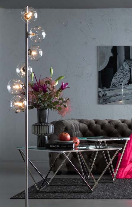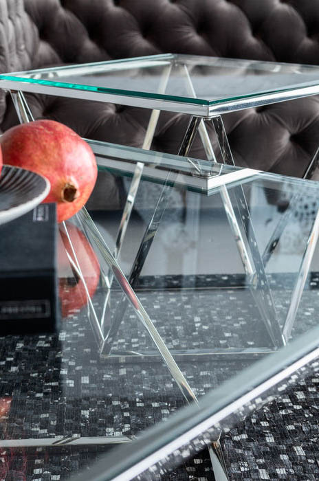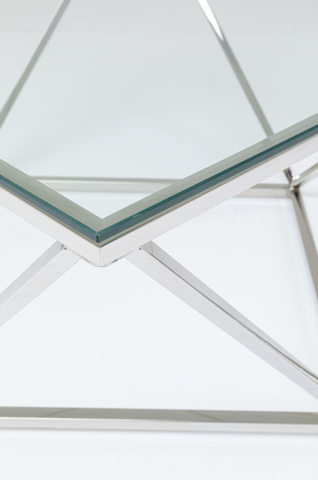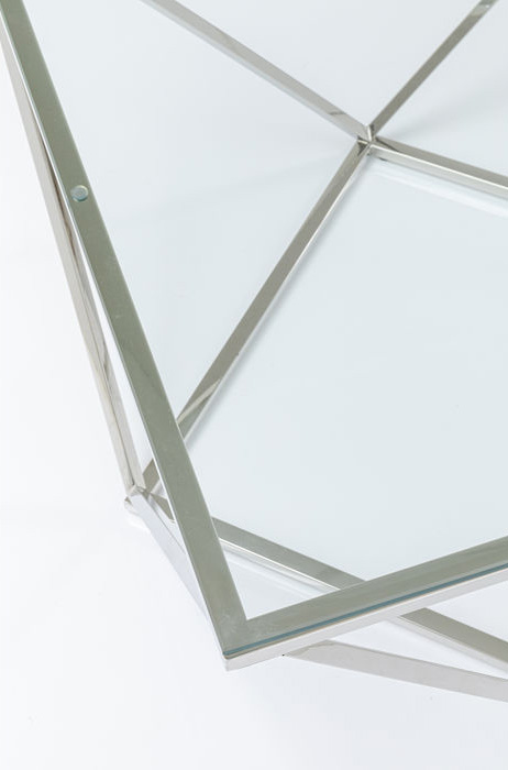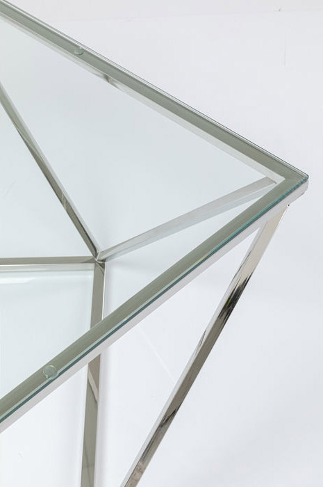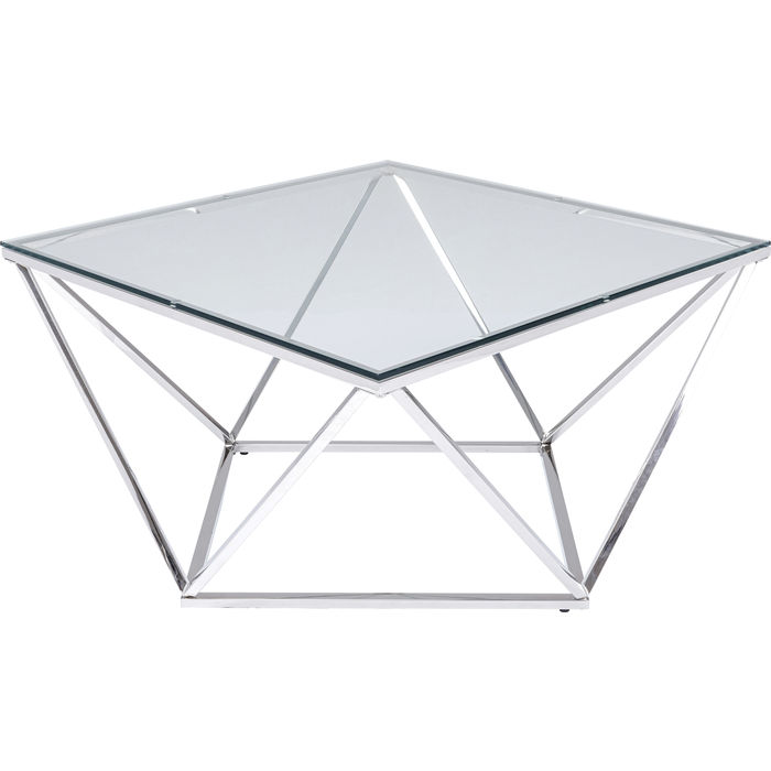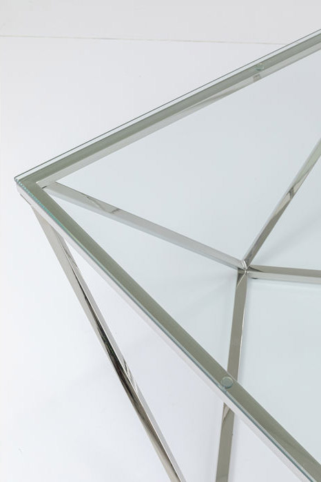 Ett läckert glasbord med geometriskt underrede i silverfinish - kromat stål. Stilren och intressant design som känns helt rätt i tiden! Bordet finns även som sidobord - se miljöbilden och de kan gärna kombineras ihop som ett större soffbord.