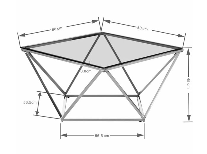 Material: bordsunderrede i rostfritt, kromat stål samt härdad glasskiva, 8 mm. Tål belastning upp till 50 kg. Mått: höjd 45 x längd 80 x bredd 80 cm. Vikt: 16,7 kg.
