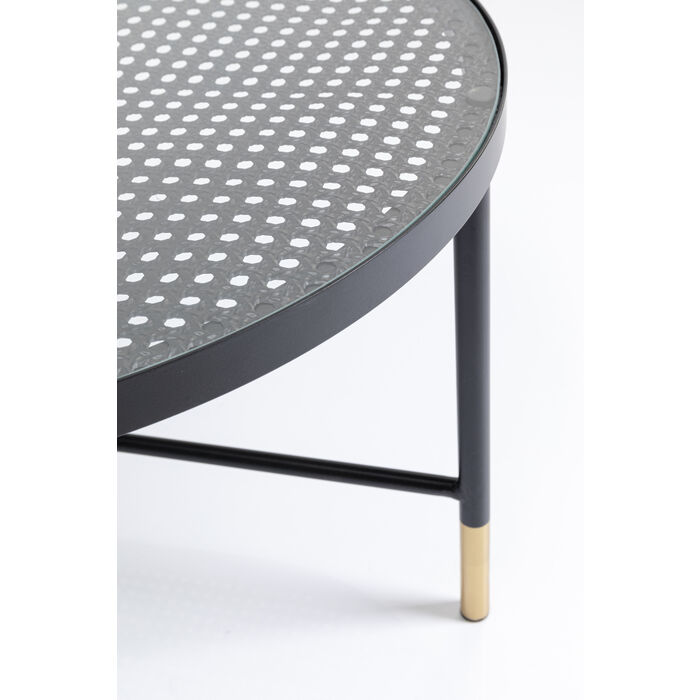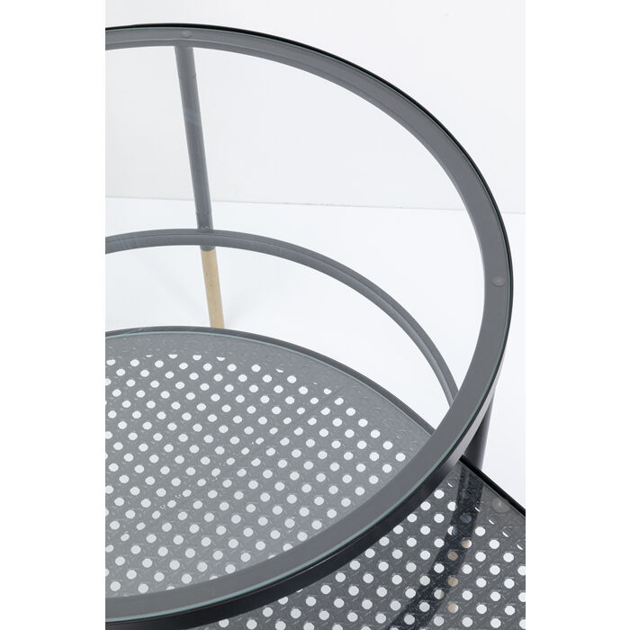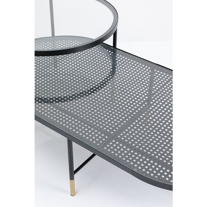 - Det större, ovala soffbordet är utsmyckat med dekorativa element i stil med wiensk mesh.