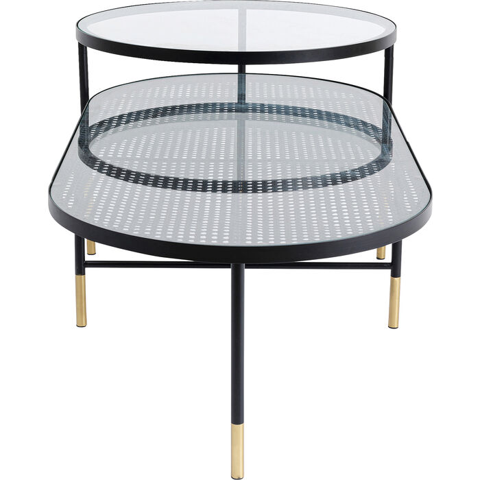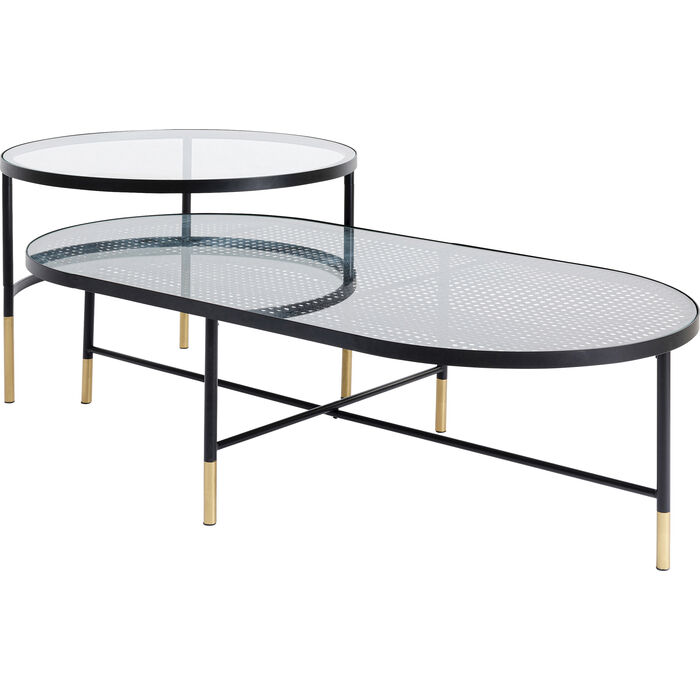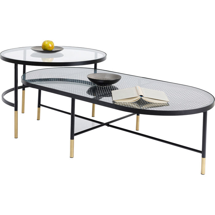 - Set med 2 soffbord, ett ovalt och ett runt, av glas och stål i svart och guldfärgade fötter, med måtten 60 x 120 x 35 cm (H/B/D).