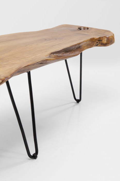 Rustik bordsskiva i massivt trä och naturligt ojämn form. Bordsunderredet är stramt och stilrent med svarta ben i s.k hårnålsmodell som ger bordet en mjuk och harmonisk form. Varje bord är unikt med träets naturliga ådring och kvist - vackert både i den moderna inredningen liksom i fjällstugan!