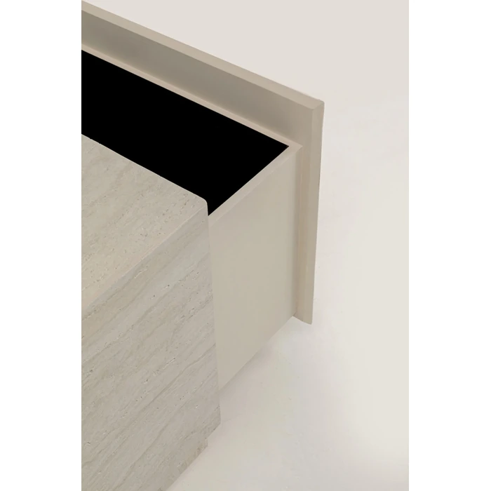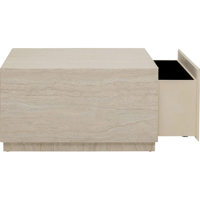 Stilrent soffbord i travertinlook med förvaring och mjuk soft-close-funktion.