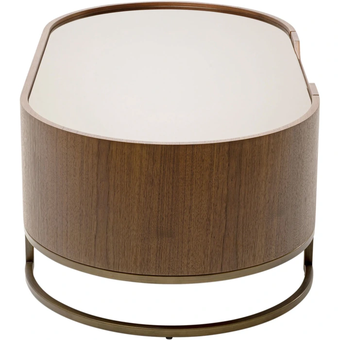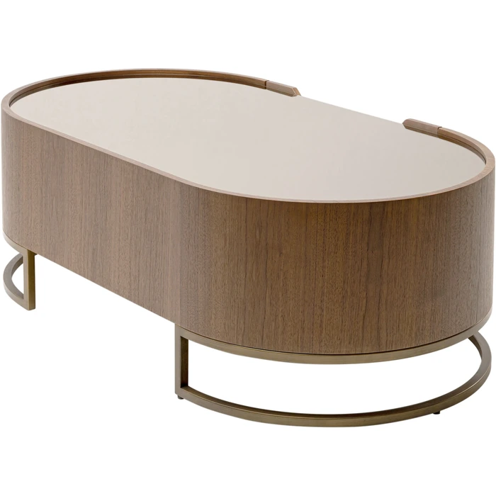 Soffbordet utstrålar harmoni med sin fina valnötsfanér, naturliga ådring och ovala form. Den mörka glasskivan ger ett modernt och lyxigt uttryck, medan den robusta stålramen ger lång livslängd och ett elegant utseende. Den integrerade lådan erbjuder smart förvaring för fjärrkontroller, tidningar och andra småsaker – alltid nära till hands men utom synhåll. En stilren möbel som kombinerar funktionalitet med tidlös design och passar i alla moderna hem.