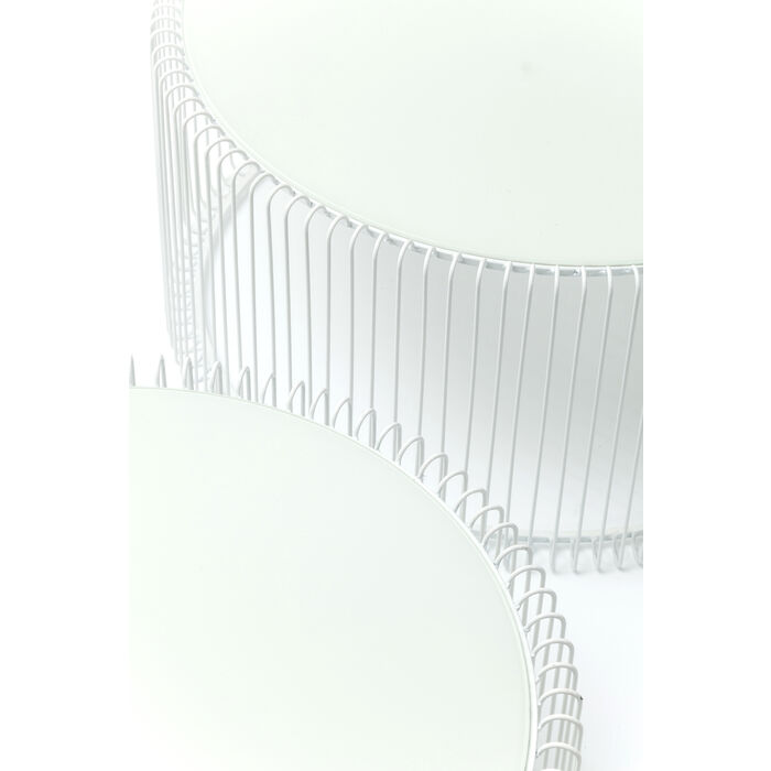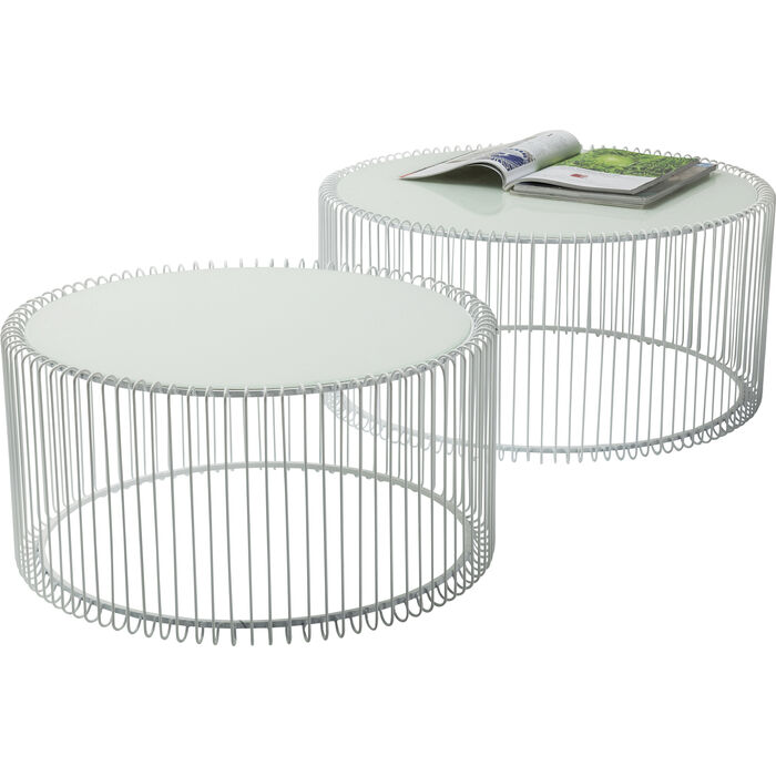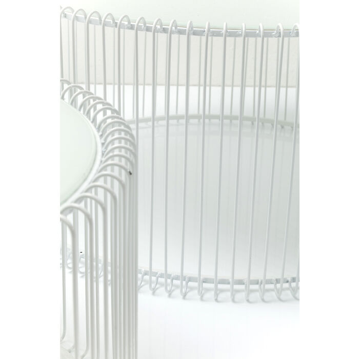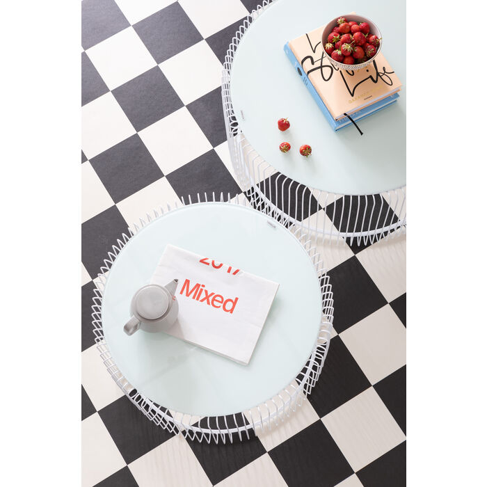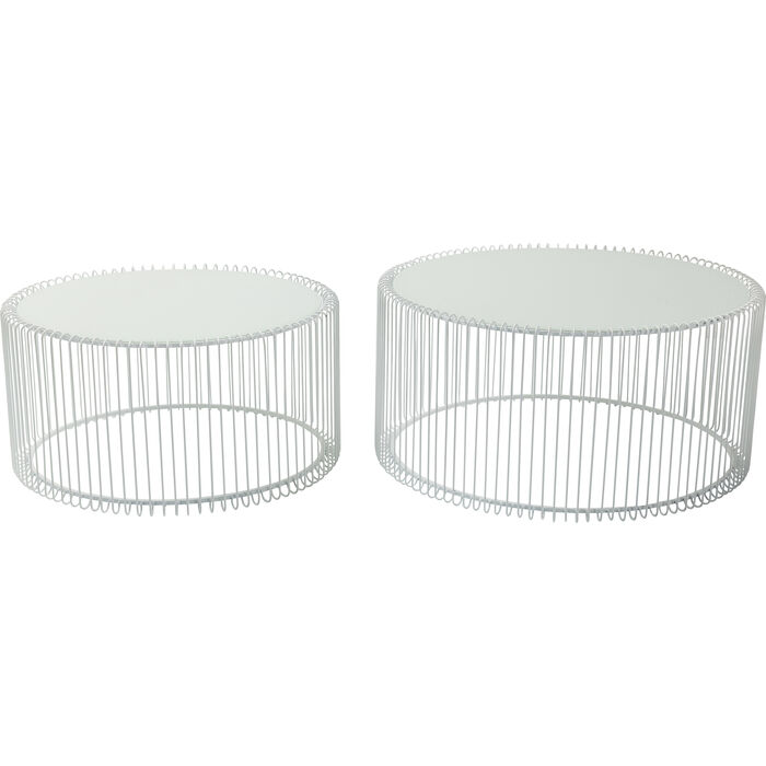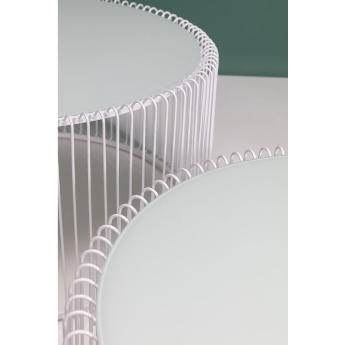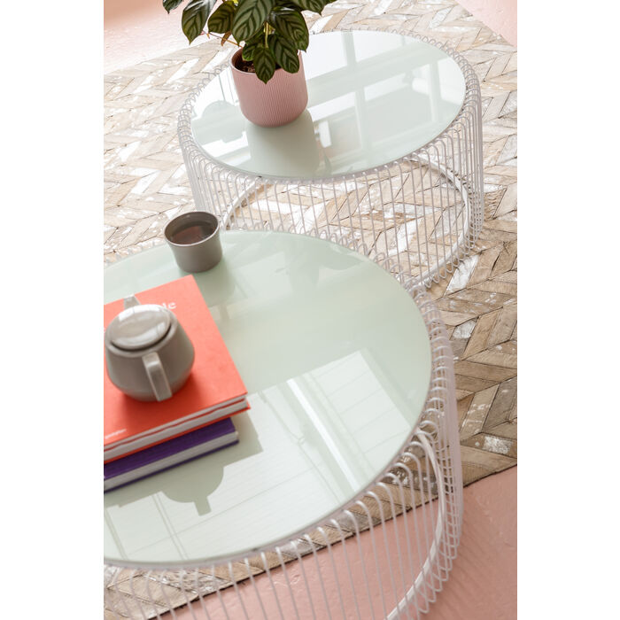 Enkla och minimalistiska stringbord i par med vit färg och spännande design. Elegant färgat glas som ståtligt visar upp tända ljus, blommor och annan vacker dekoration. Perfekta soffbord för vardagsrummet med trendig trådram och grafiskt formspråk som hyllar minimalismens elegans. Dessa runda glasbord passar bra till rektangulära soffor och som enstaka bord med hörnsoffan eller dina favoritfåtöljer. Lätta att flytta när du vill anpassa möbleringen. Trådliknande underrede i pulverlackerat stål, även kallat hårnålsmodell, perfekt för den enkla och minimalistiska inredningen. En modern och smart designad komposition som trots sitt effektiva utseende framstår som lätt, nästan viktlös.