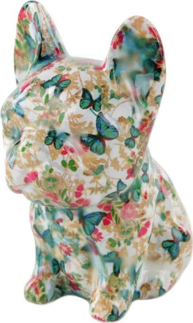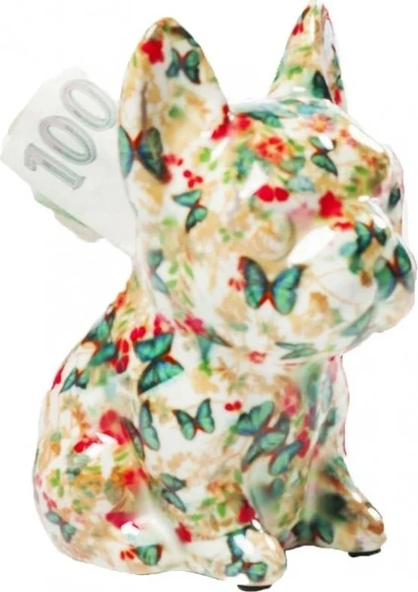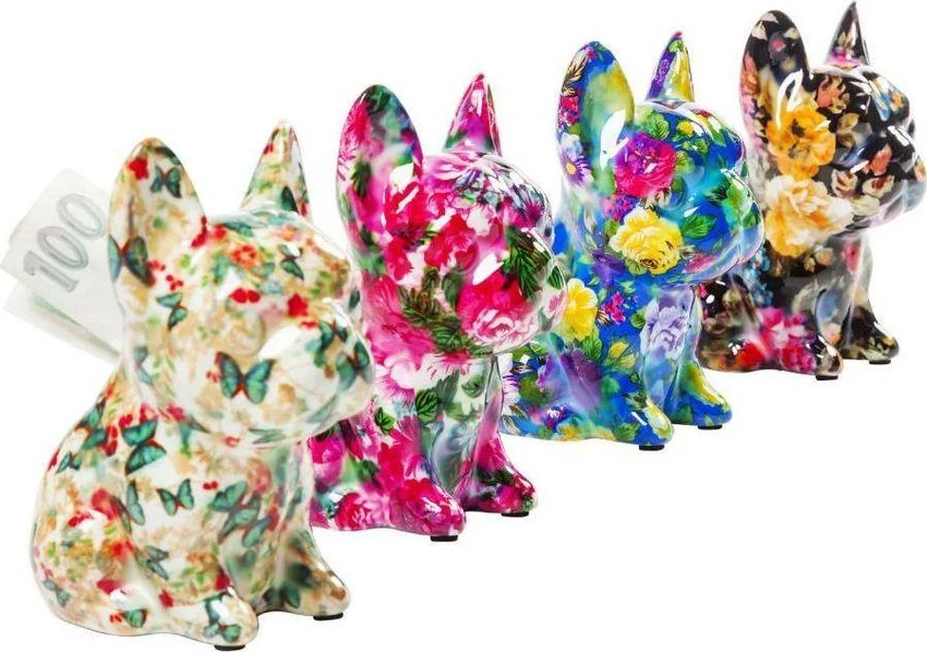 Ett färgglatt mönster pryder denna fyrbenta vän och hund mot en blommig bakgrund. Den söta vovven ser inte bara häftigt ut, den kan även användas som en sparbössa. "Sparbössa Dog Fiore" finns i fyra versioner.