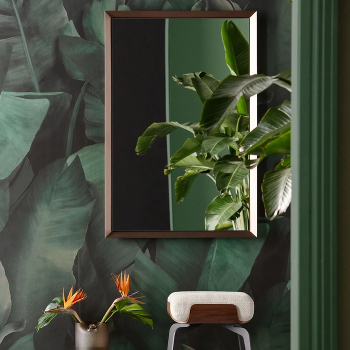 Den fasade spegelkanten och den varma kaffe metallfinishen ger ett sofistikerat uttryck. Monteras vertikalt och öppnar upp hall, sovrum eller vardagsrum med extra ljus och rymd.
