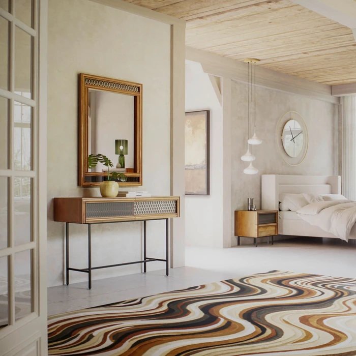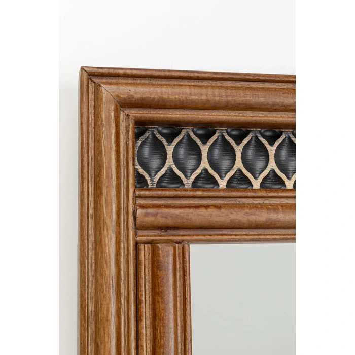 En dekorativ väggspegel som kombinerar spegelglasets rymd med en ram i massivt mangoträ. Den taktila reliefstrukturen ger karaktär utan att ta över, och den generösa storleken skapar ljus och rymd i hall, vardagsrum eller sovrum. Häng stående för en klassisk känsla eller liggande över en skänk – den rena ramen lyfter konst och textilier runtom och smälter in i både moderna och mer naturliga interiörer.