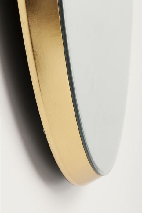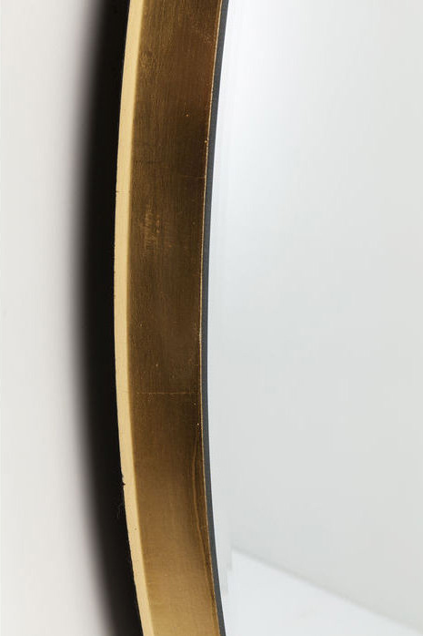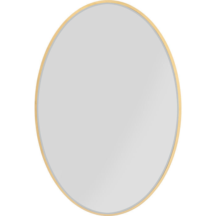 En stor oval guldspegel med slät elegant ram och spegelglaset monterat utanpå ramen vilket ger ett annorlunda och djupt intryck. Spegeln kan hängas både på höjden och bredden och finns även i rektangulär samt rund form.