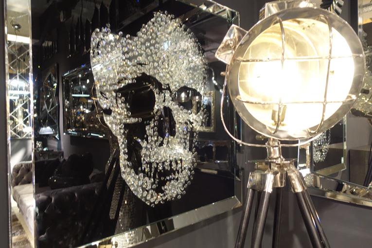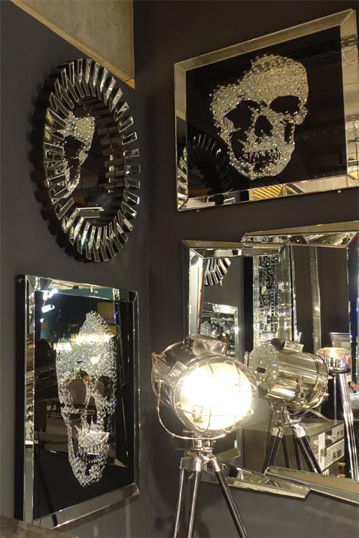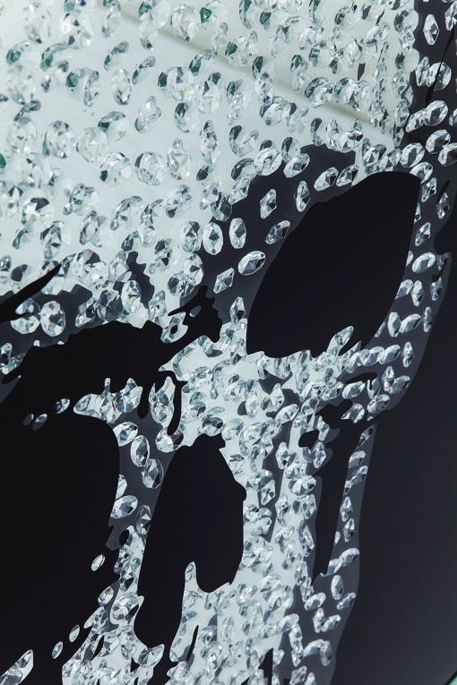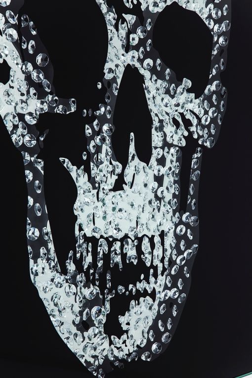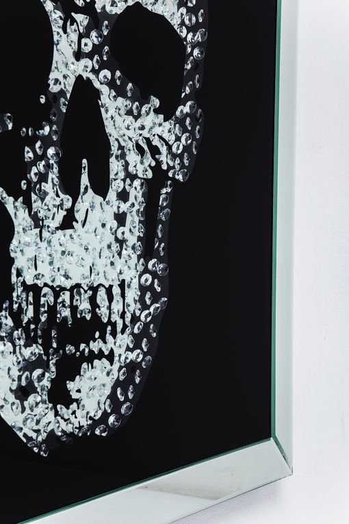 En tavla för dig som älskar inredning med döskallar! Denna tavla är gjort helt i spegelglas och glaskristaller med döskallemotiv på svart botten. Mycket hög kvalitet. En sann eye-catcher!