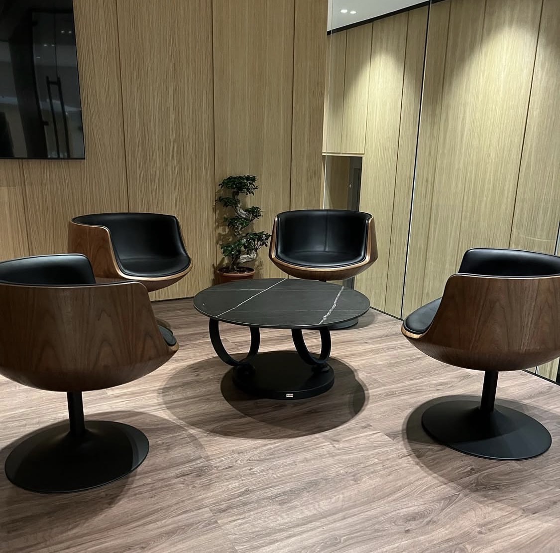 En riktigt snygg stol eller clubfåtölj i stram, sportig design och fin kombination av valnöt och svart. Stolen är snurrbar. Material: Underrede i lackat stål, stomme i glasfiber och sittskal i valnötsfanerad mdf samt klädsel i skinnimitation.