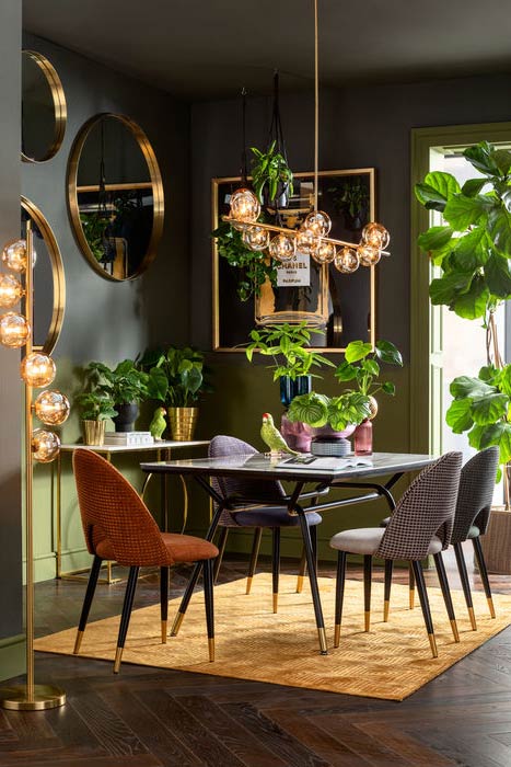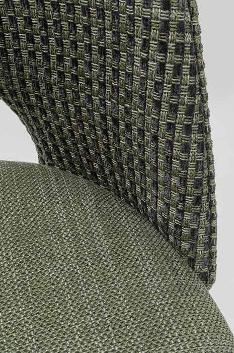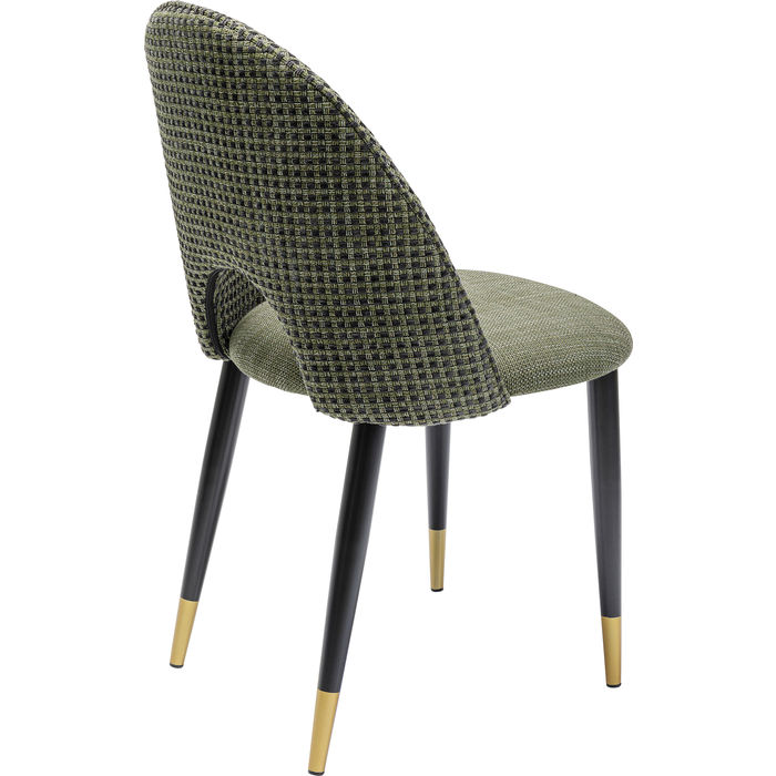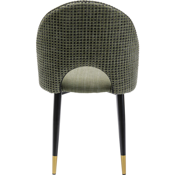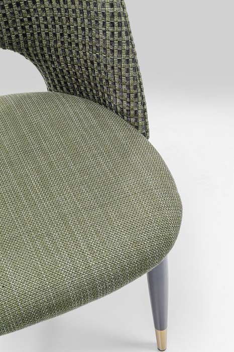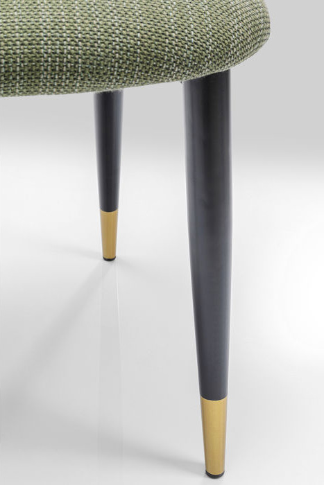 Stol Hudson i en sober dovt grön klädsel med elegant vävstruktur. Stolen har en modern 50-tals inspirerad design i både form och material. En nätt stol med mycket skön sittkomfort och omslutande ryggstöd. Stolen finns även i beige, orange och blå klädsel - alla med svarta ben och mässingsdetalj.
