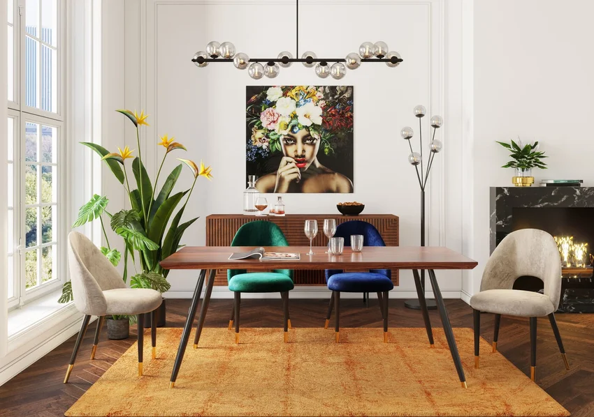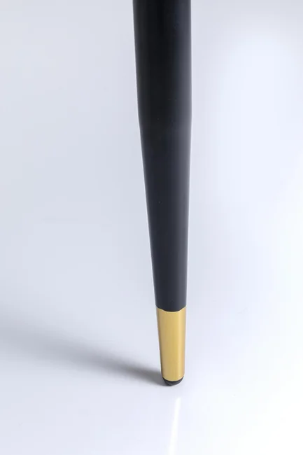 Den skickliga blandningen av form, färg och material gör denna stoppade stol till en speciell sittmöbel. Dess svartlackerade ben med guldfötter bildar en charmig kontrast till dess textilöverdrag och det smart skräddarsydda ryggstödet. Perfekt stol till matplats, oavsett om det är för ett fyrkantigt, rektangulärt eller runt bord.
