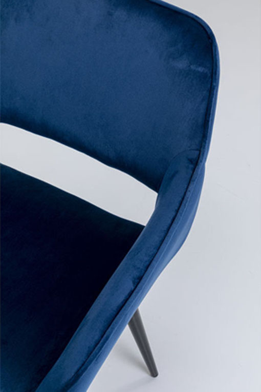 Elegant och stilren matrumsstol med armstöd, som gjord för långa sittningar kring matsalsbordet då den är mycket bekväm. Stolen är helklädd i sammet med smäckra svarta ben i pulverlacket stål. Sitthöjden är anpassad för att passa standardhöjd på matbord men passar också fint som mötesstol.