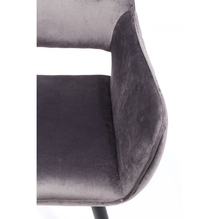 Elegant och stilren matrumsstol med armstöd, som gjord för långa sittningar kring matsalsbordet då den är mycket bekväm. Stolen är helklädd i konstgjord sammet med smäckra svarta ben i pulverlacket stål. Sitthöjden är anpassad för att passa standardhöjd på matbord men passar också fint som mötesstol.