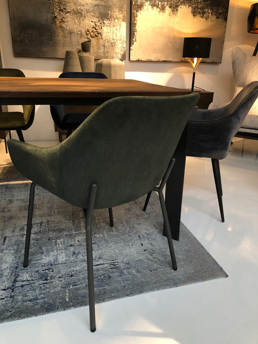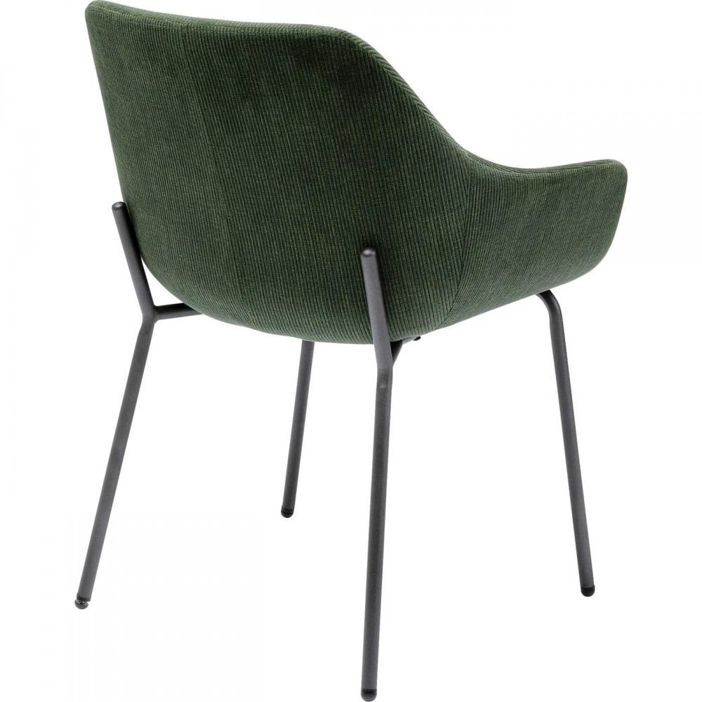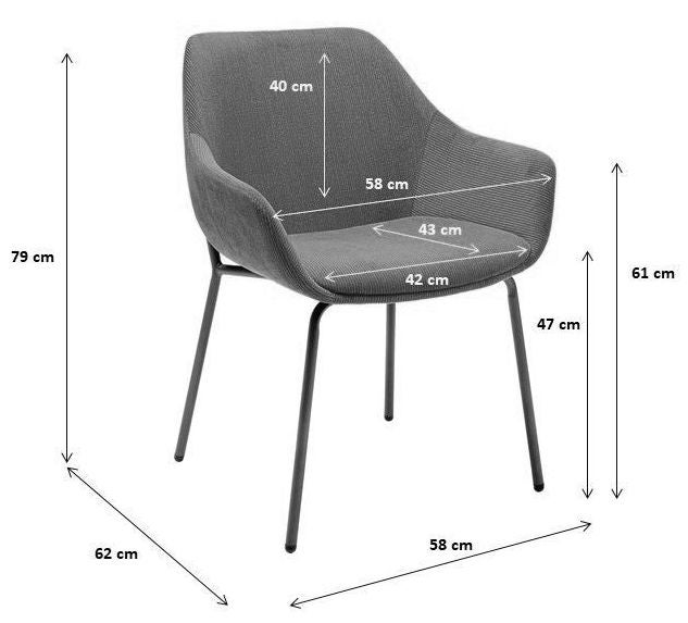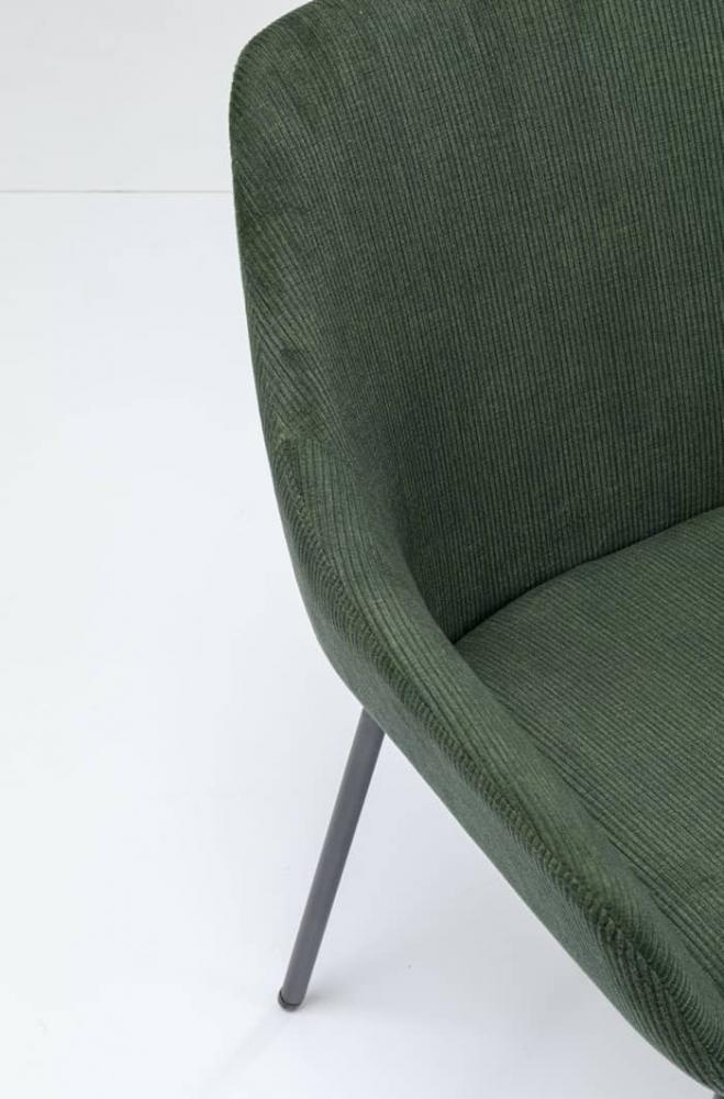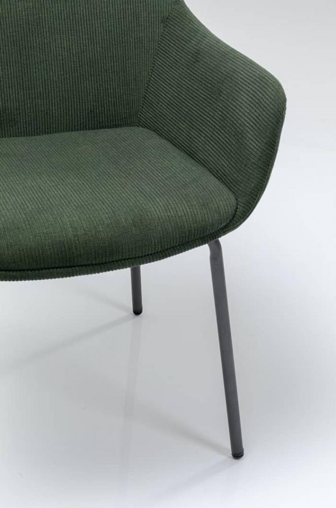 Snygg modern stol i klassisk form, här med klädsel i smalspårig manchester i en mustig grön nyans samt stilrena, strama ben i svart lackat stål. Lägg märke till underredet som går upp mot ryggstödet - en fin detalj! Stolen har stabil och bekväm sittkomfort med lätt stoppning i sits, rygg och armstöd som gör den passande som matstol och mötesstol för längre sittningar men även som nätt fåtölj. Stolen finns även i en dov orange manchester. Material: sits och ryggstöd av obehandlad spånskiva, stoppning av polyuretan samt klädsel i stark polyesterväv. Ben i pulverlackat stål. Mått: höjd 79 x bredd 58 x djup 62 cm. Sitthöjd 46,5 cm (sittandes). Vikt: 7,5 kg.