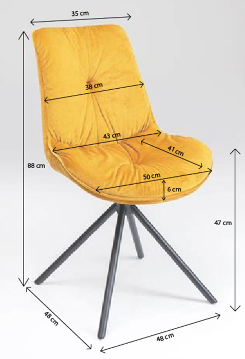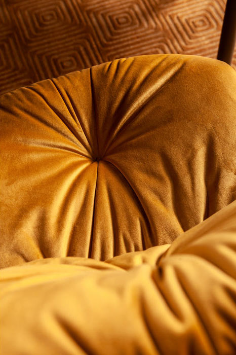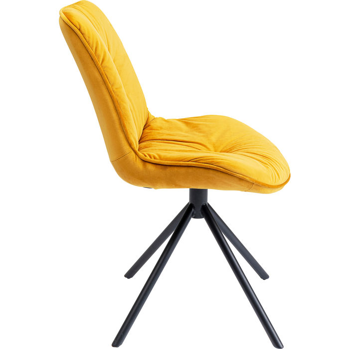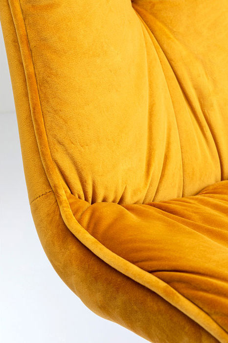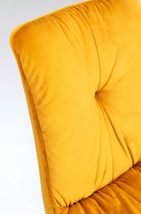 En snygg stol i klar gul sammet med mjuk sittkomfort - som gjord för långa sittningar. Stolen är klädd i gul sammet och har generöst med stoppning som ger dekorativa djuphäftningar. Stramt och elegant kryssunderrede i svart lack. Stolen finns även med armstöd - se Karmstol Mila Gul.