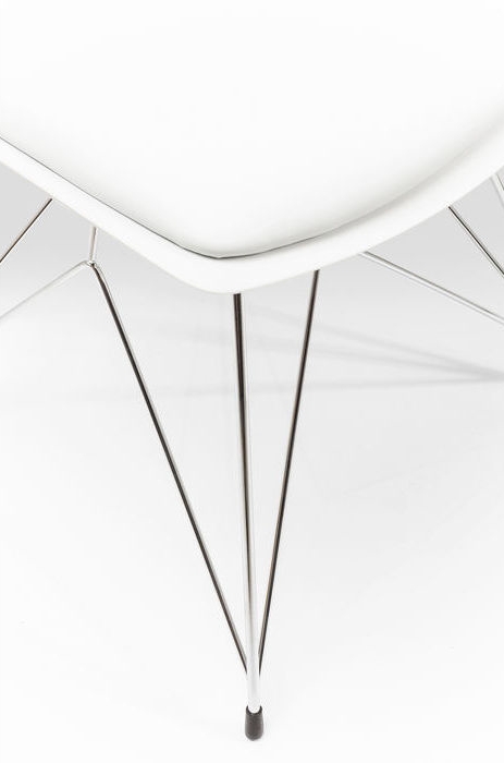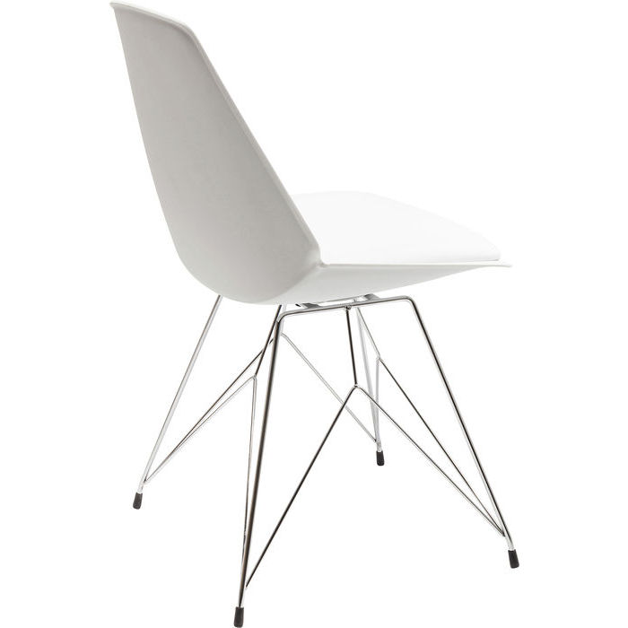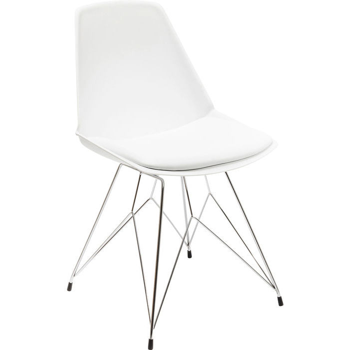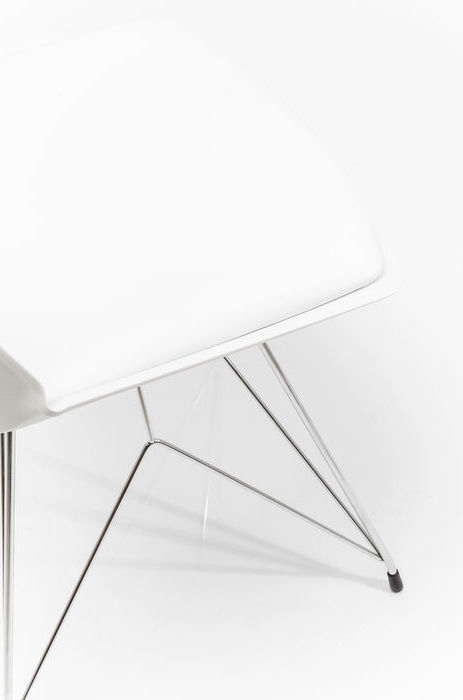 En mycket prisvärd och snygg vit stol med dekorativ underrede i krom. Mycket skön sittkomfort. Stolen finns även med svart underrede och svart sits. Belastning 110 kg. Material: Underrede i pulverlackat stål. Sits i polypropen och klädsel i syntettextil med slitstark polyuretanbeläggning. Mått: höjd 86, x bredd 48 x djup 50,5 cm. Sitthöjd: 48,5 cm.