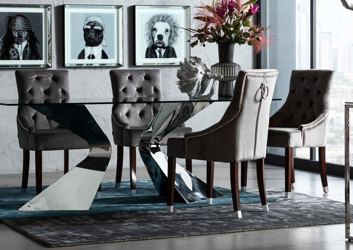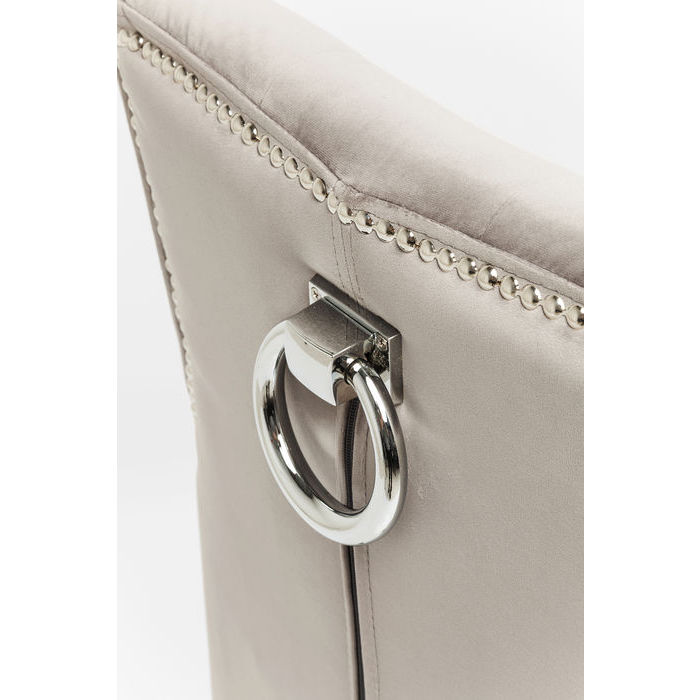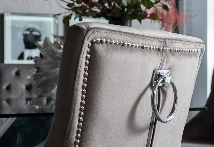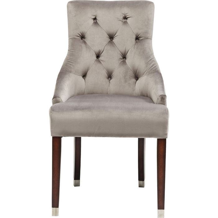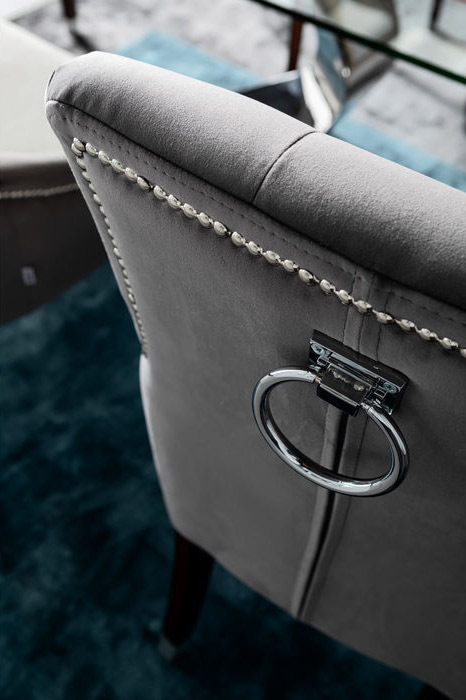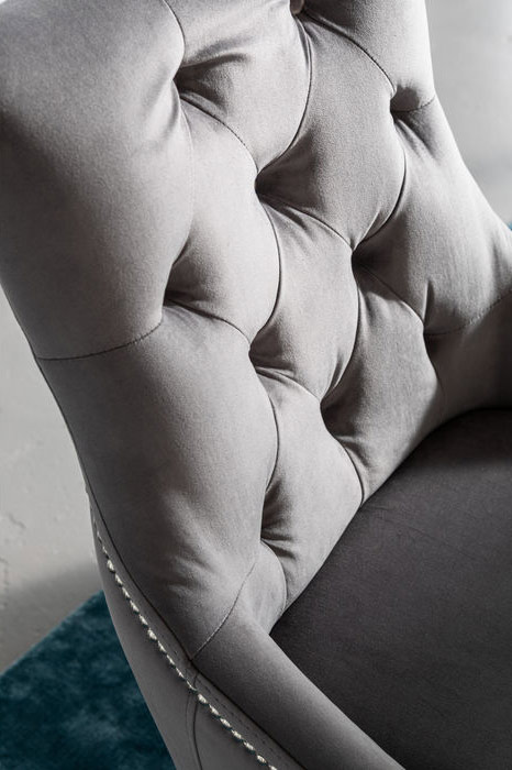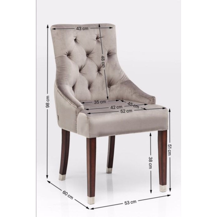 En mycket elegant matstol i grå sammetslyster med fina detaljer. Stolen har klädda, djuphäftade knappar, nitar samt dekorativt handtag i ryggsidan och smäckra ben i brunlackad bok med kromade fötter.  Stolen har hög sittkomfort och fin kvalitet med stilstark sammet, 100 000 martindale. Mått: höjd 98 x bredd 53 x 60 cm.
