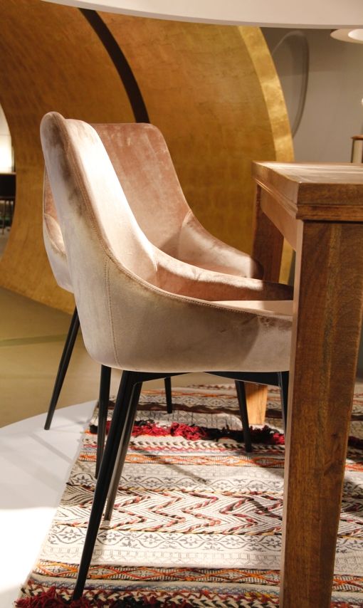 Nätt och elegant matstol i champagnefärgad sammet - favorit!