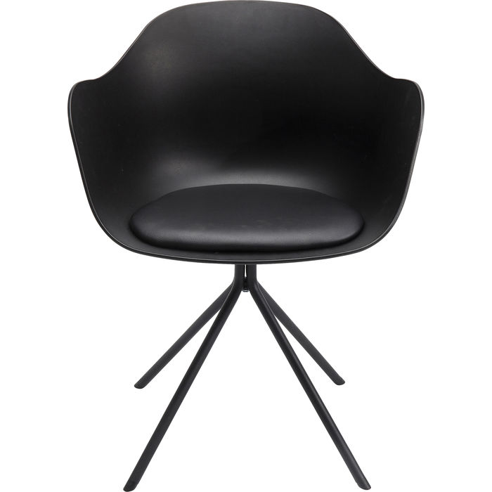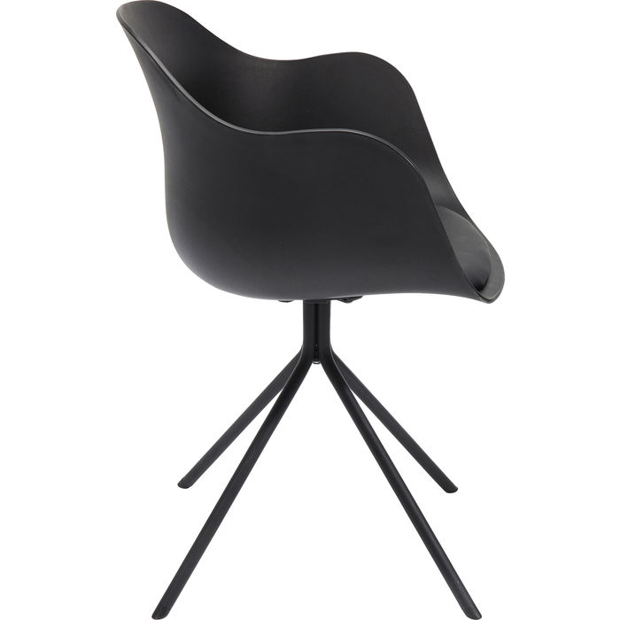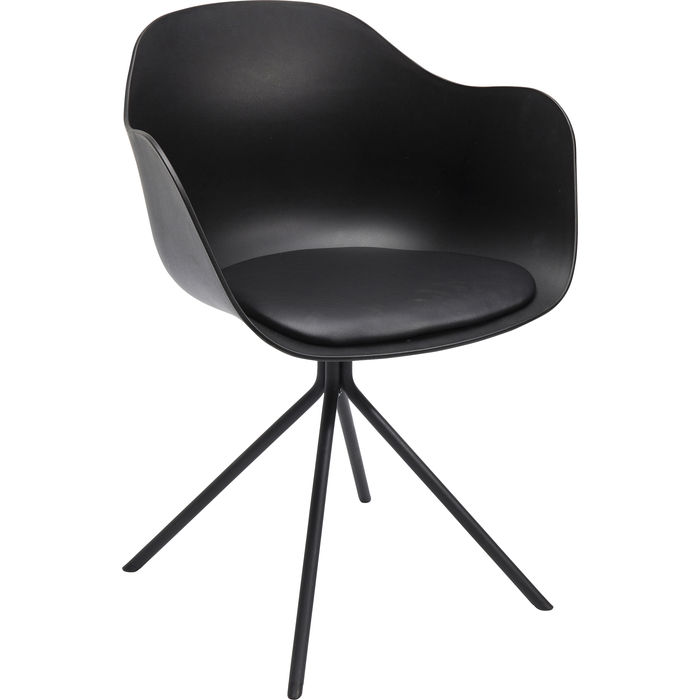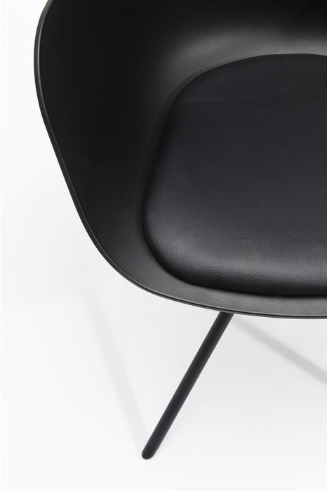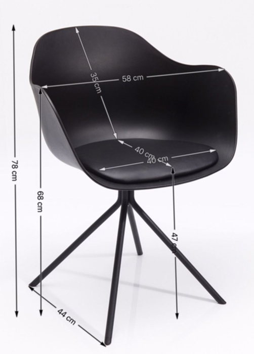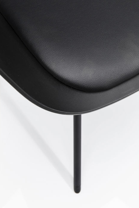 En modern och stilren stol i svartaste svart som framhäver böljande form och ett smäckert kryssunderrede. Stolen är praktisk, lätt i vikt och lätt att torka av. Mjuk sits av stoppad dyna för mjuk sittkomfort. Material: Svetsat underrede i pulverlacket stål, skal av polypropylen och dyna av kallskum klädd med konstläder. Max belastning 136 kg. Mått: höjd 77,5 x bredd 58 x djup 53 cm. Sitthöjd 48 cm. Vikt: 6,6 kg. Max belastning 136 kg. Underredet monteras.