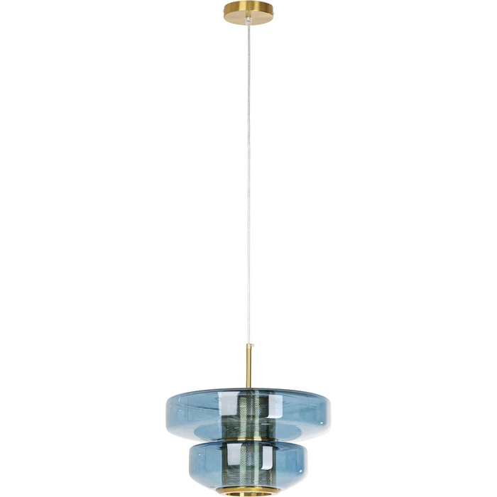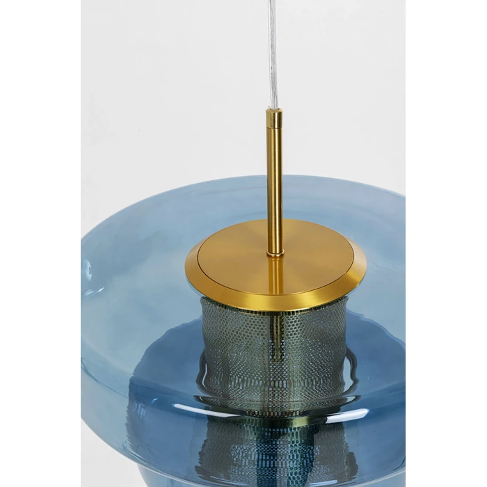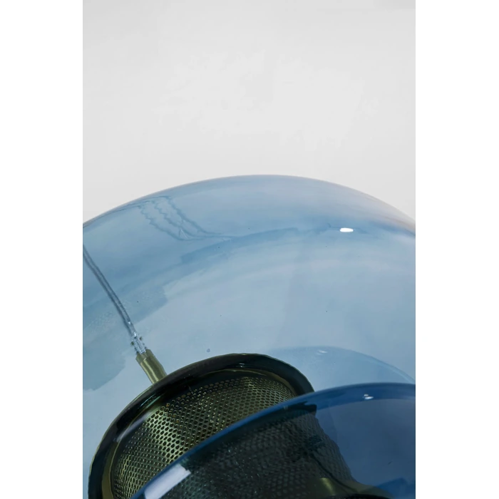 Elegant blå taklampa med skulptural glaskupa och gyllene detaljer.