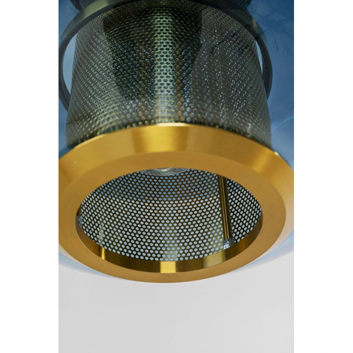 Taklampa Arcadia i blått kombinerar modern elegans med en stämningsfull belysningsupplevelse. Den skulpturala kupan i blått galvaniserat glas sprider ett mjukt och atmosfäriskt ljus, medan den cylindriska innerskärmen i finmetallnät skapar dekorativa reflektioner på väggar och tak. Den gyllene stommen i titanbelagt stål ger lampan ett exklusivt uttryck och gör den till ett tydligt designstatement.